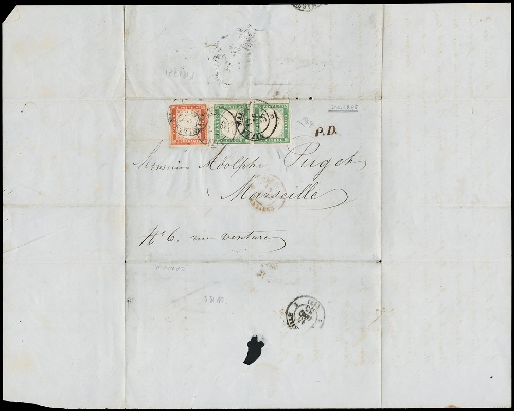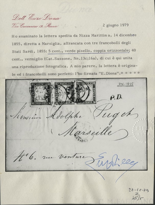 1855 - 5c verde pisello, coppia orizzontale e 40c vermiglio, da 'NIZZA MARITTIMA 14 DIC 55' a Marsiglia. Rarissima affrancatura con francobolli perfetti. CF E.Diena (Sassone 13c,16a - Euro 39.000)