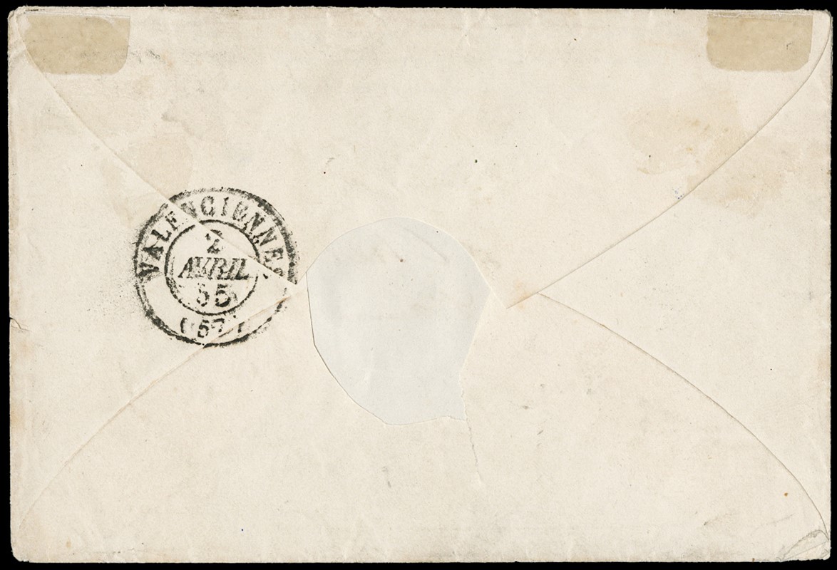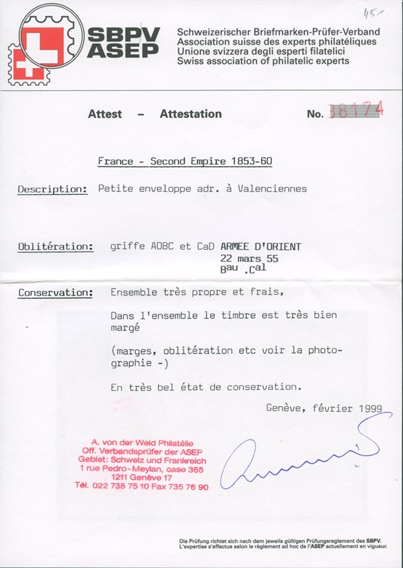 1855 - Francia 20c azzurro Napoleone III (Yvert 14), annullato losanga di punti 'AO3C' dell''ARMEE D'ORIENT Bau C.AL 22 MARS 55' per Valencienne. Eccezionale qualita', CF Van Der Weid (Ceres 2008 - Euro 2.915+++)