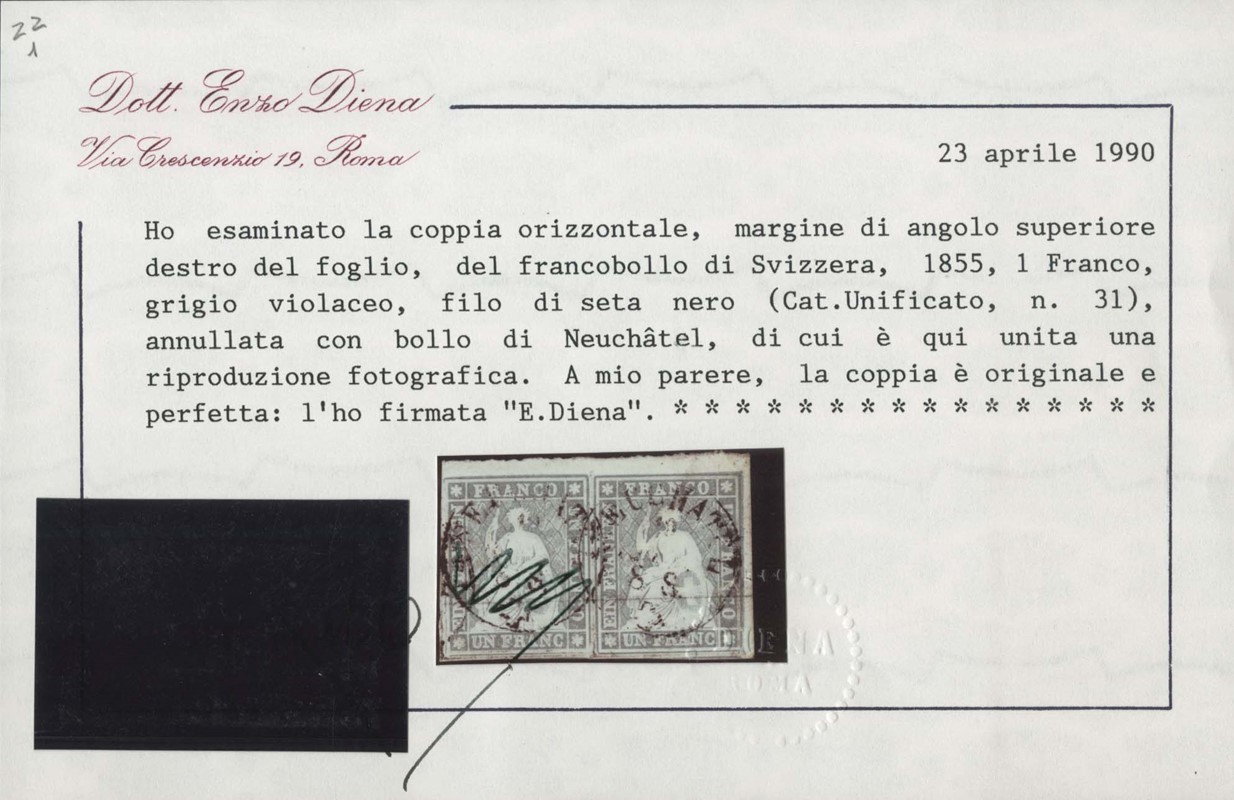1855 - Strubel, 1Fr grigio violaceo, con filo di seta nero, coppia con grandi margini usata a 'NEUCHATEL'. Eccezionale. Firma G.Oliva e CF E.Diena (Zumstein 27C - Euro - )