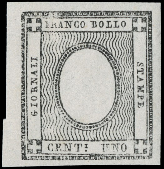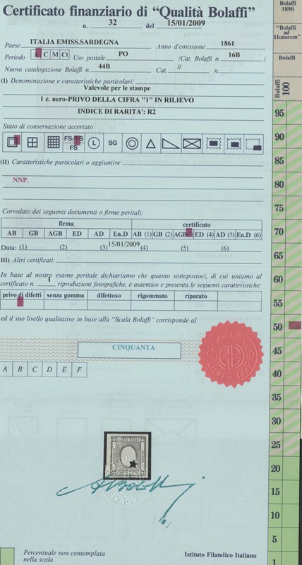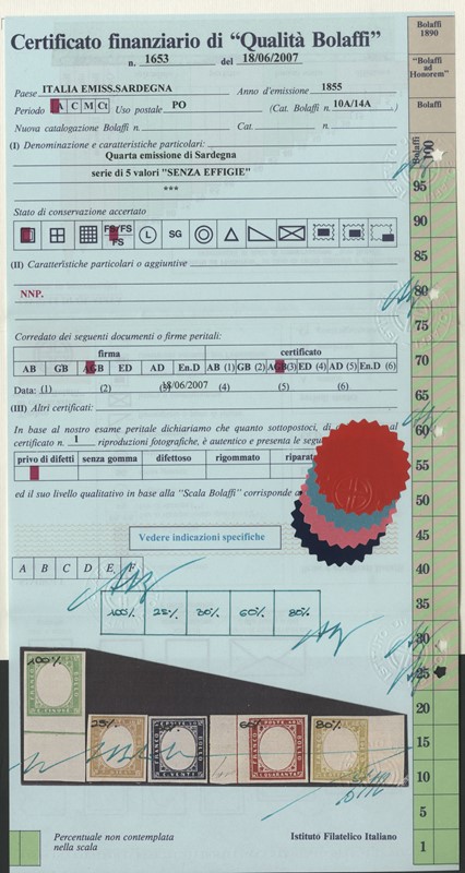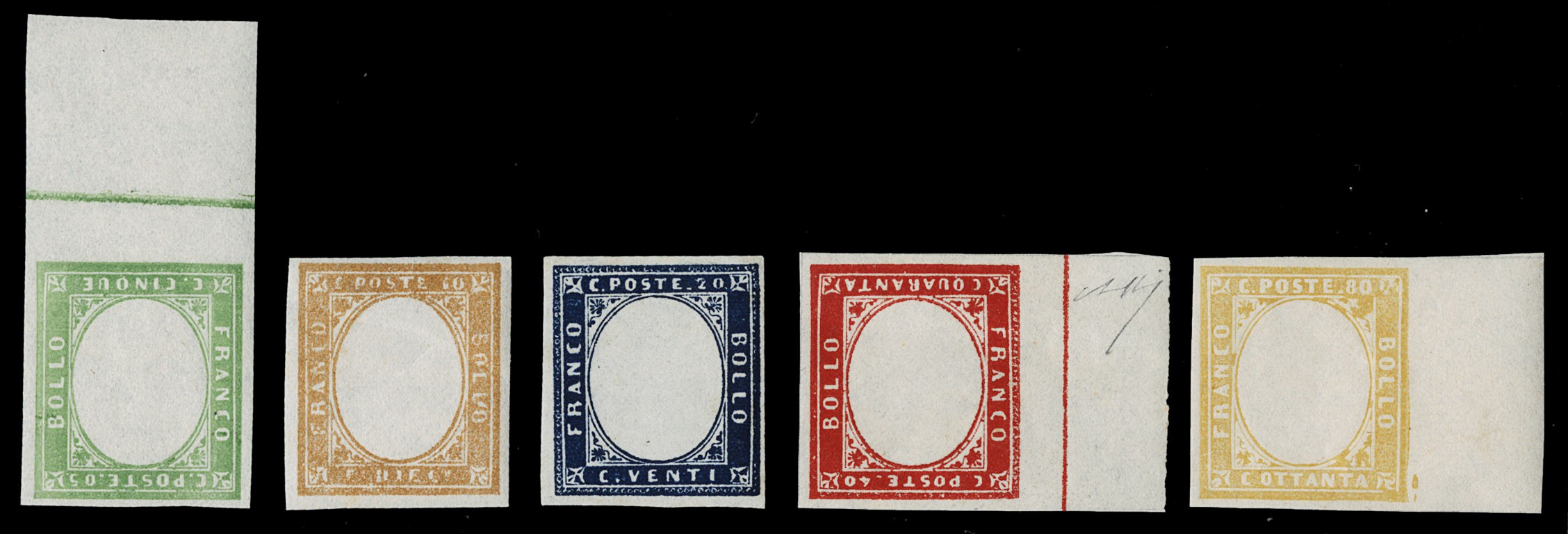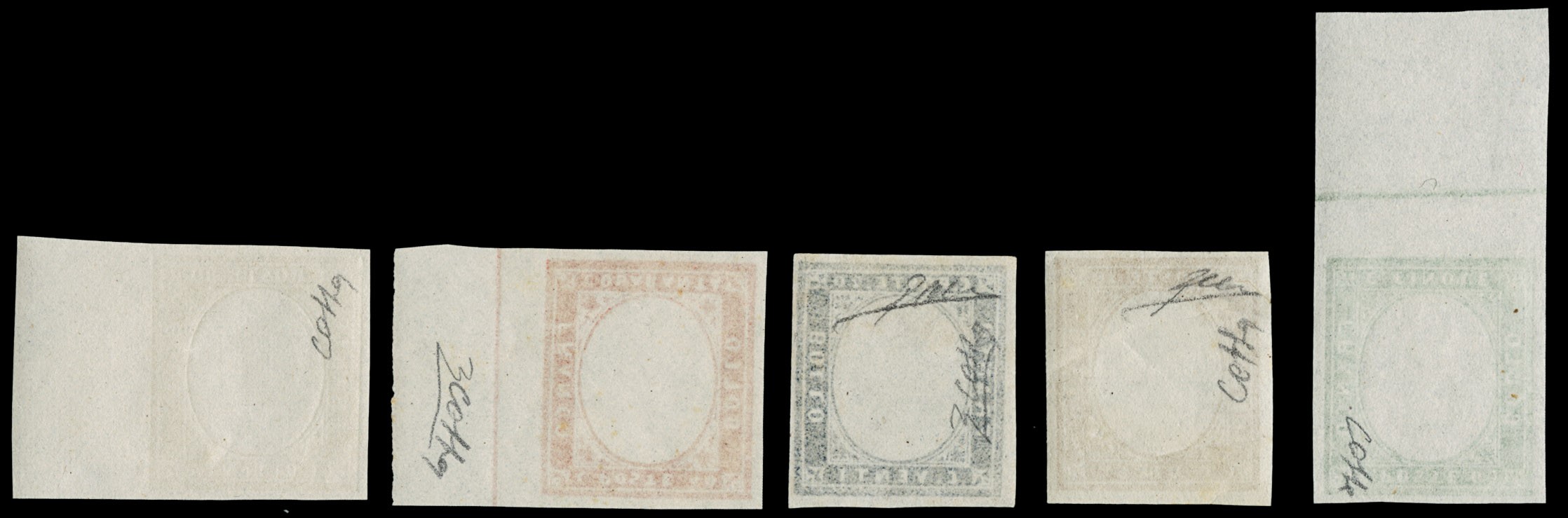 1855/61 - la IV emissione completa di cinque valori, escluso il 3 lire, senza effigie, con i francobolli per giornali da 1c e da 2c senza la cifra SL. Il 5c, 40c e 80c BdF integrali, il tutto montato su cartoncini Bolaffi. Tre CF finanziari Bolaffi (Bolaffi 10A/14A+16B+17B - Euro - )