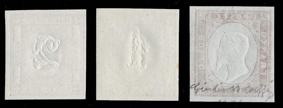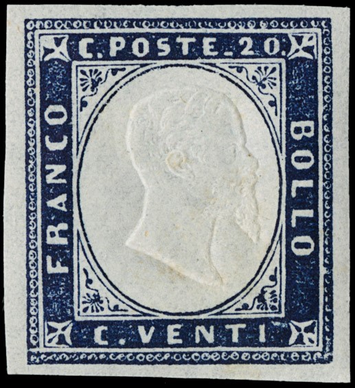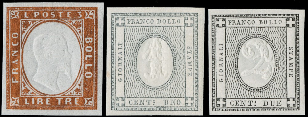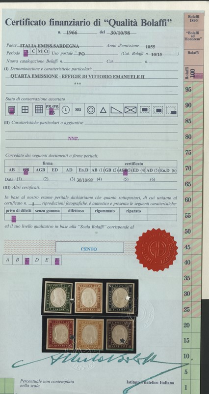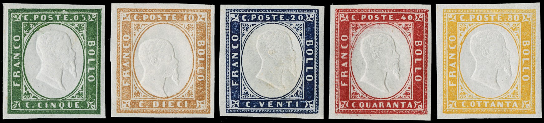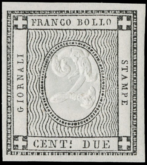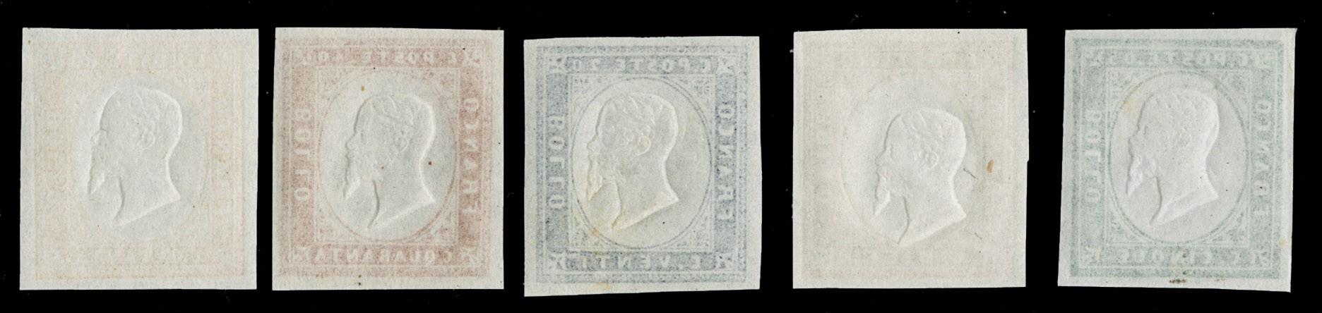 1855/61 - la IV emissione completa di sei valori, con i francobolli per giornali da 1c e da 2c, tutti SL. CF Bolaffi 100% per i sei valori di PO (Sassone 13/20 - Euro 3.000)
