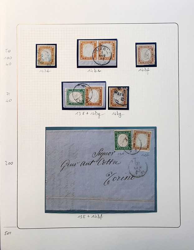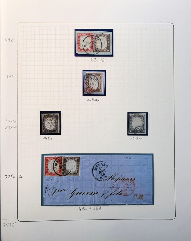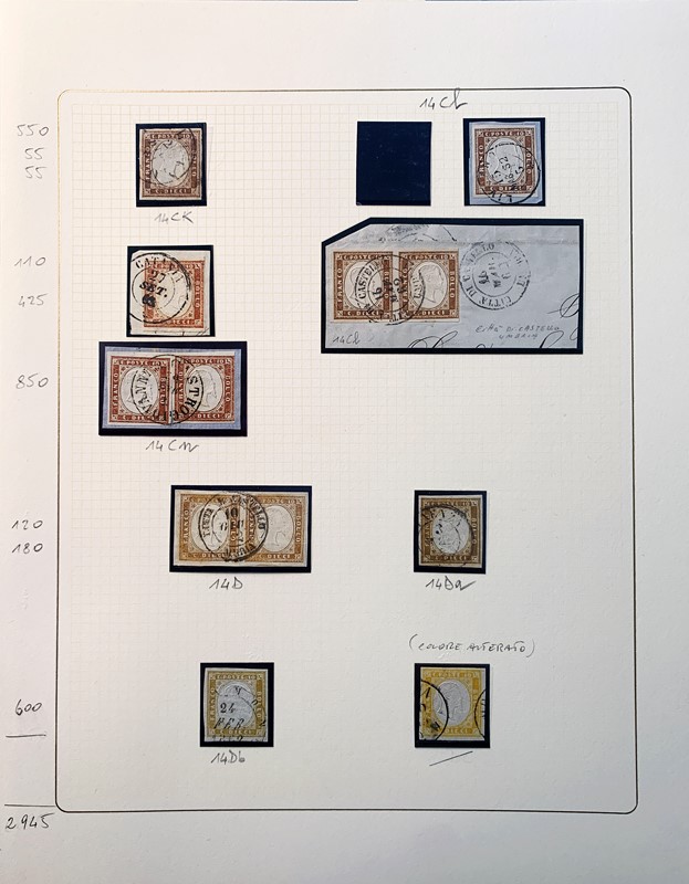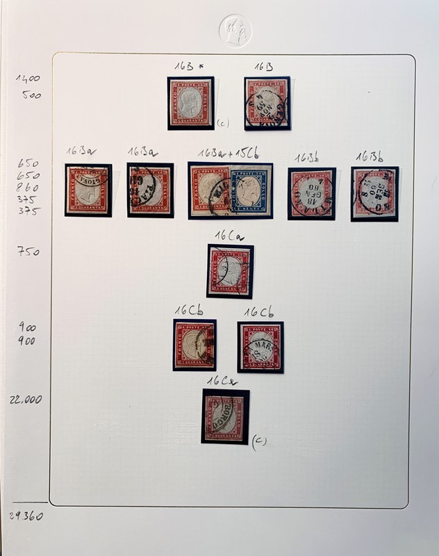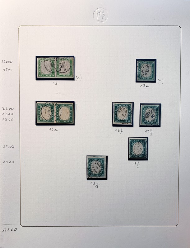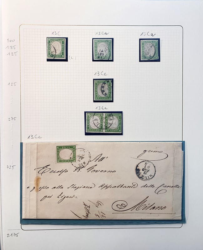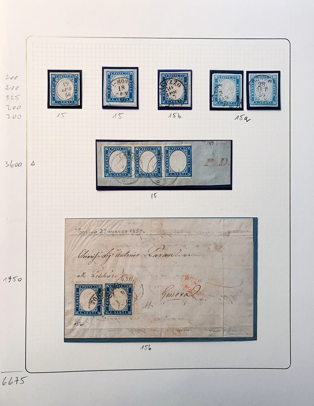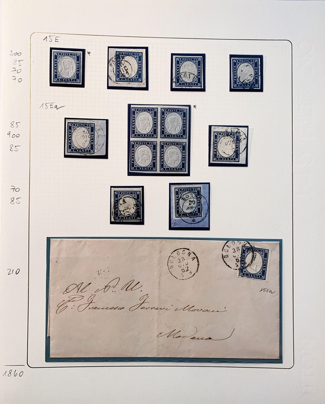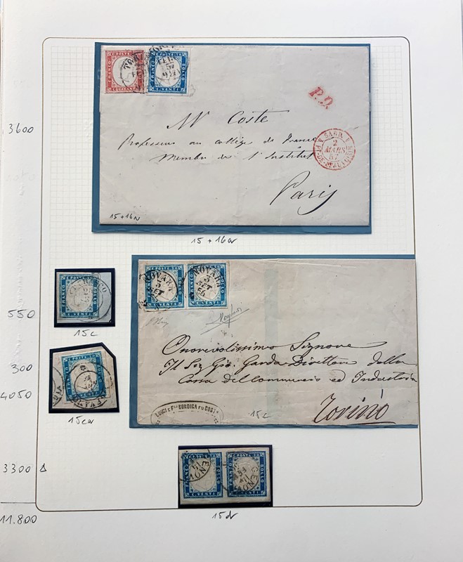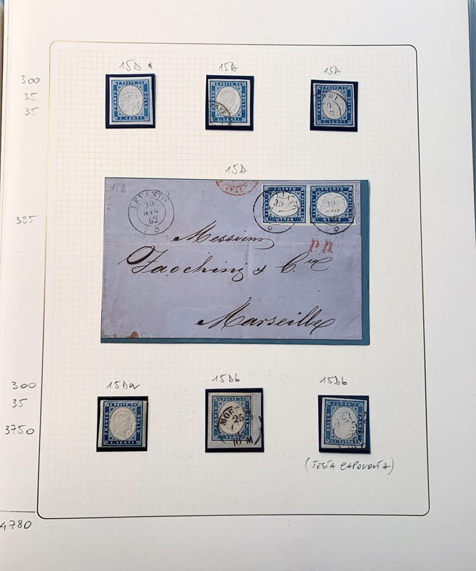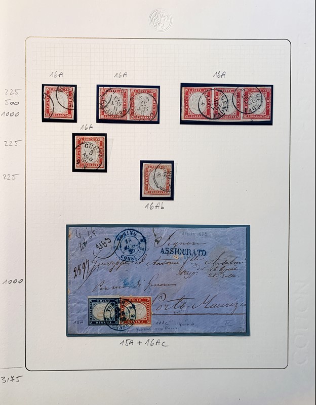 1855/61 - SARDEGNA: avanzatissima collezione incentrata sui colori della IV emissione, composta da francobolli nuovi, usati e su lettera. Sono presenti molti colori rari, alcune strisce, blocchi e affrancature. Irripetibile insieme per lo specialista, per lo piu' di ottima qualita'. 35 CF (Sassone oltre Euro 260.000)