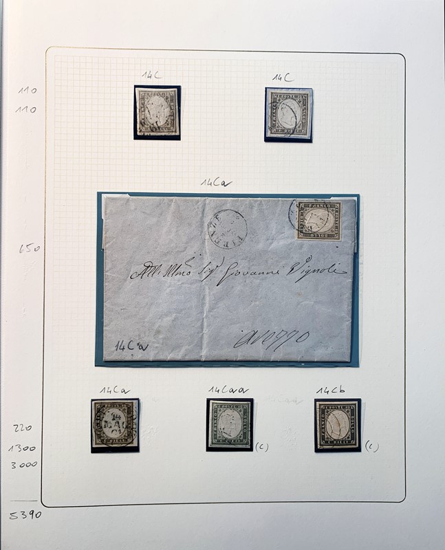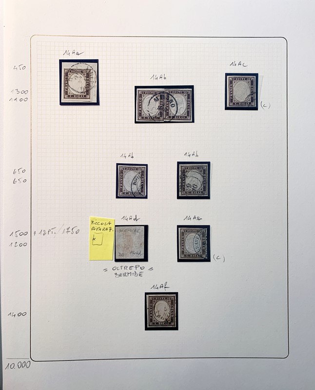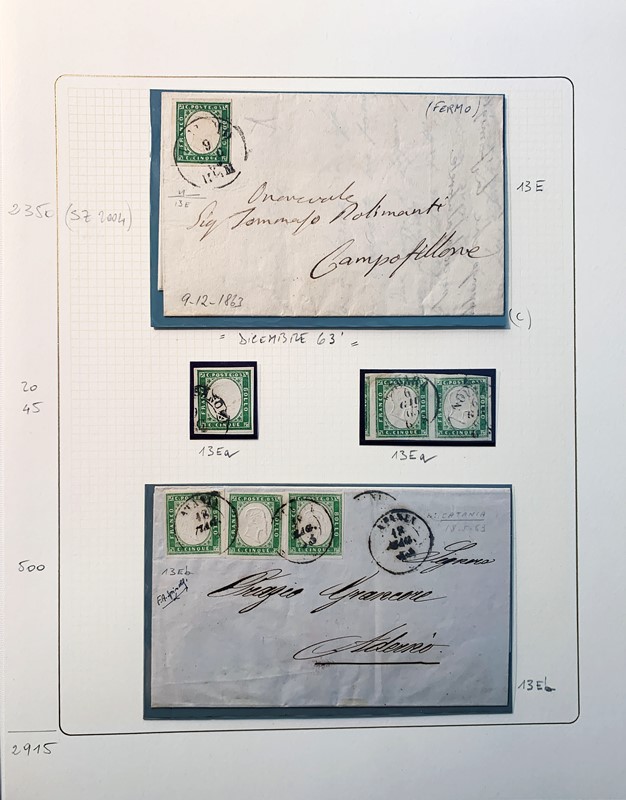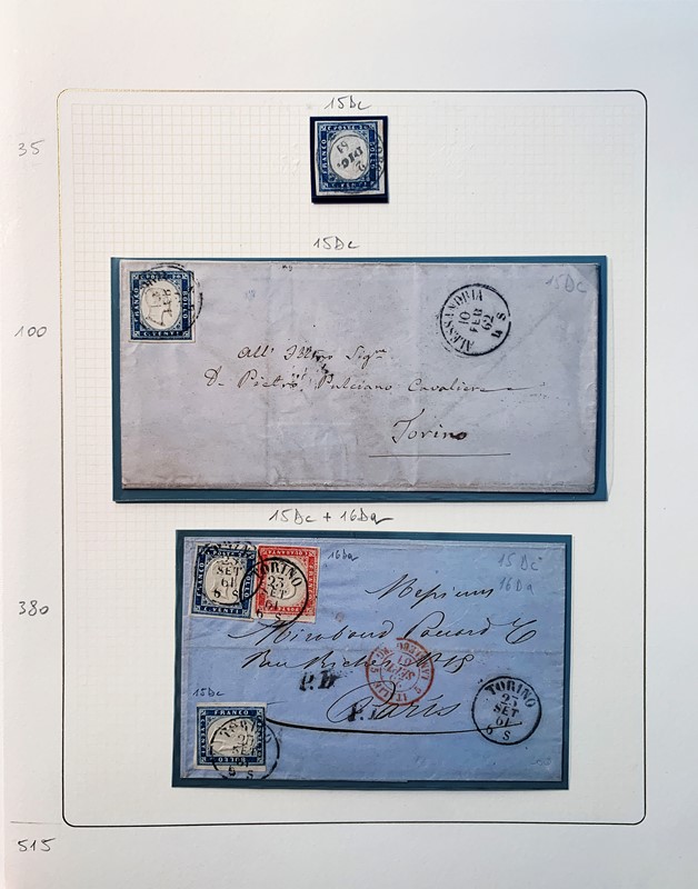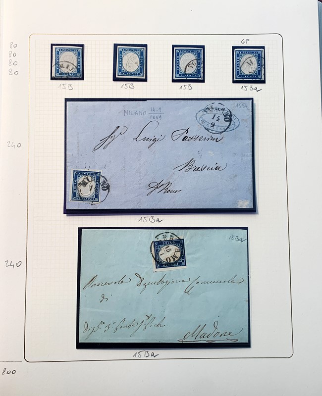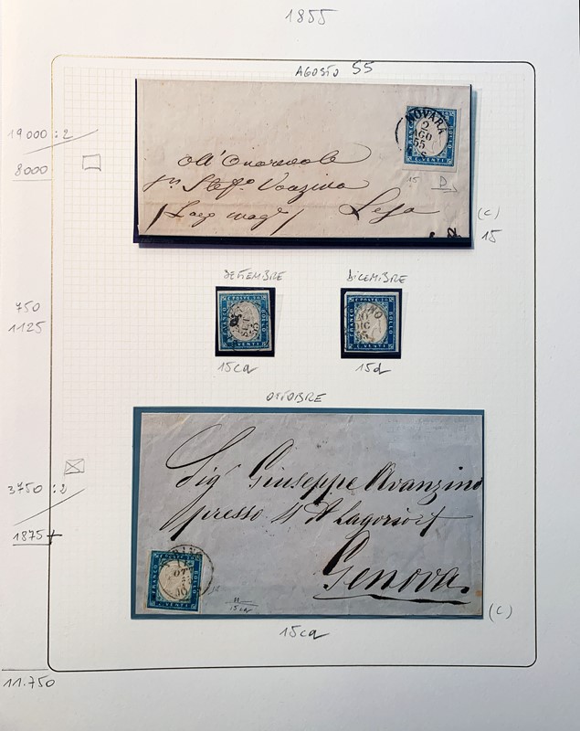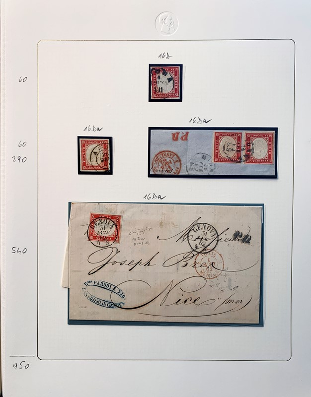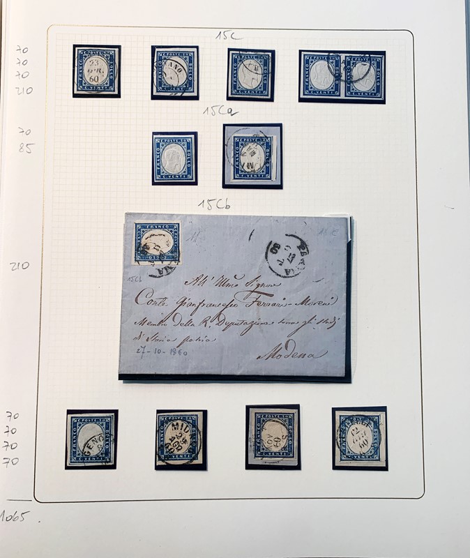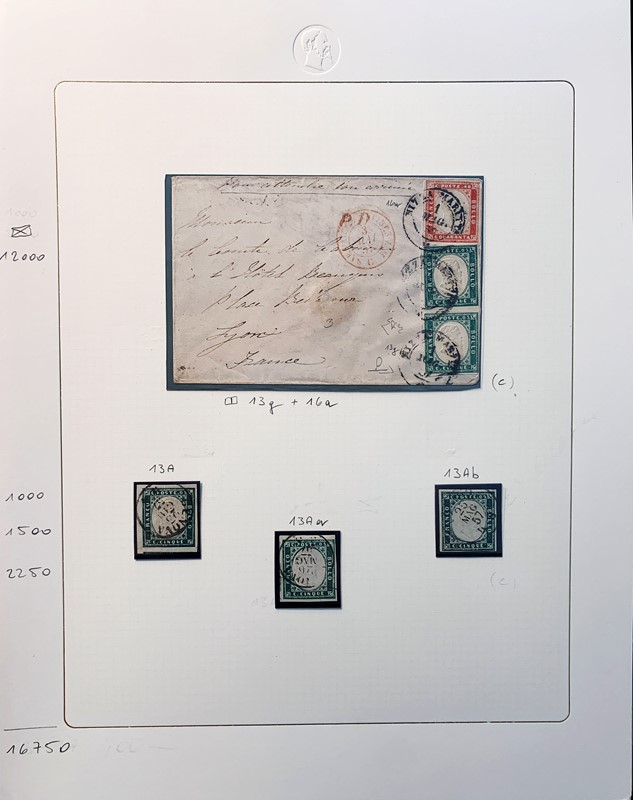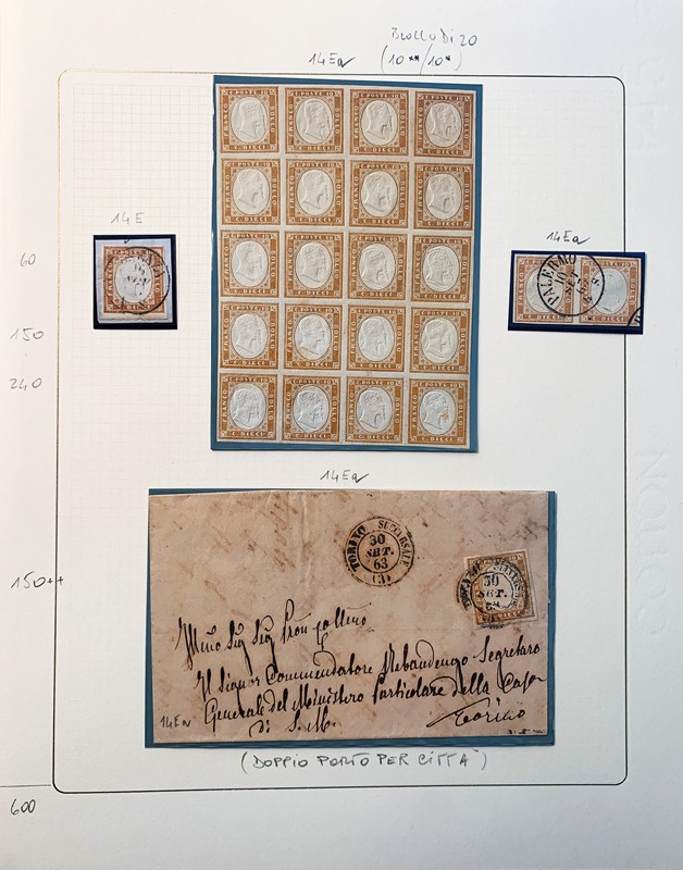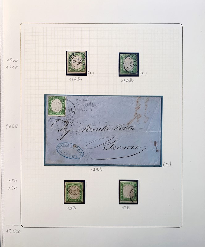 1855/61 - SARDEGNA: avanzatissima collezione incentrata sui colori della IV emissione, composta da francobolli nuovi, usati e su lettera. Sono presenti molti colori rari, alcune strisce, blocchi e affrancature. Irripetibile insieme per lo specialista, per lo piu' di ottima qualita'. 35 CF (Sassone oltre Euro 260.000)