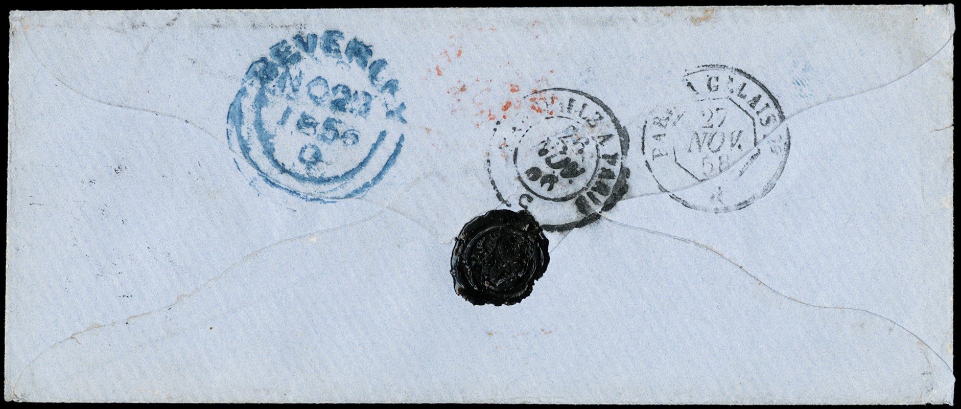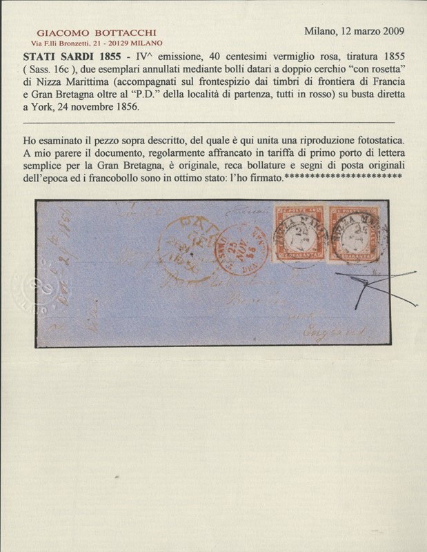 1856 - 40c vermiglio rosa, tir.55, due esemplari da 'NIZZA MARITTIMA 24 NOV 56' a York (Inghilterra). Sigla Vaccari, CF Bottacchi (Sassone 16c - Euro 16.000)