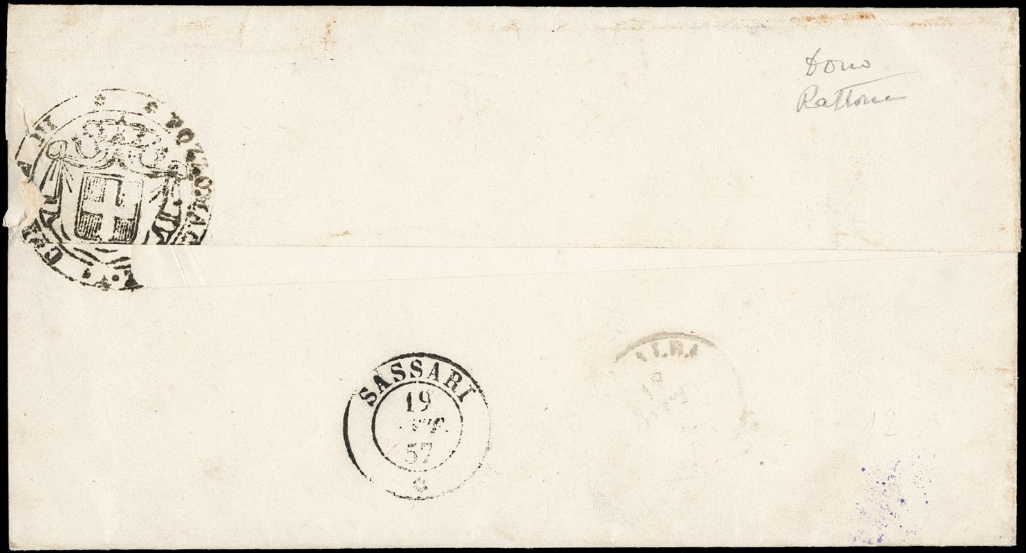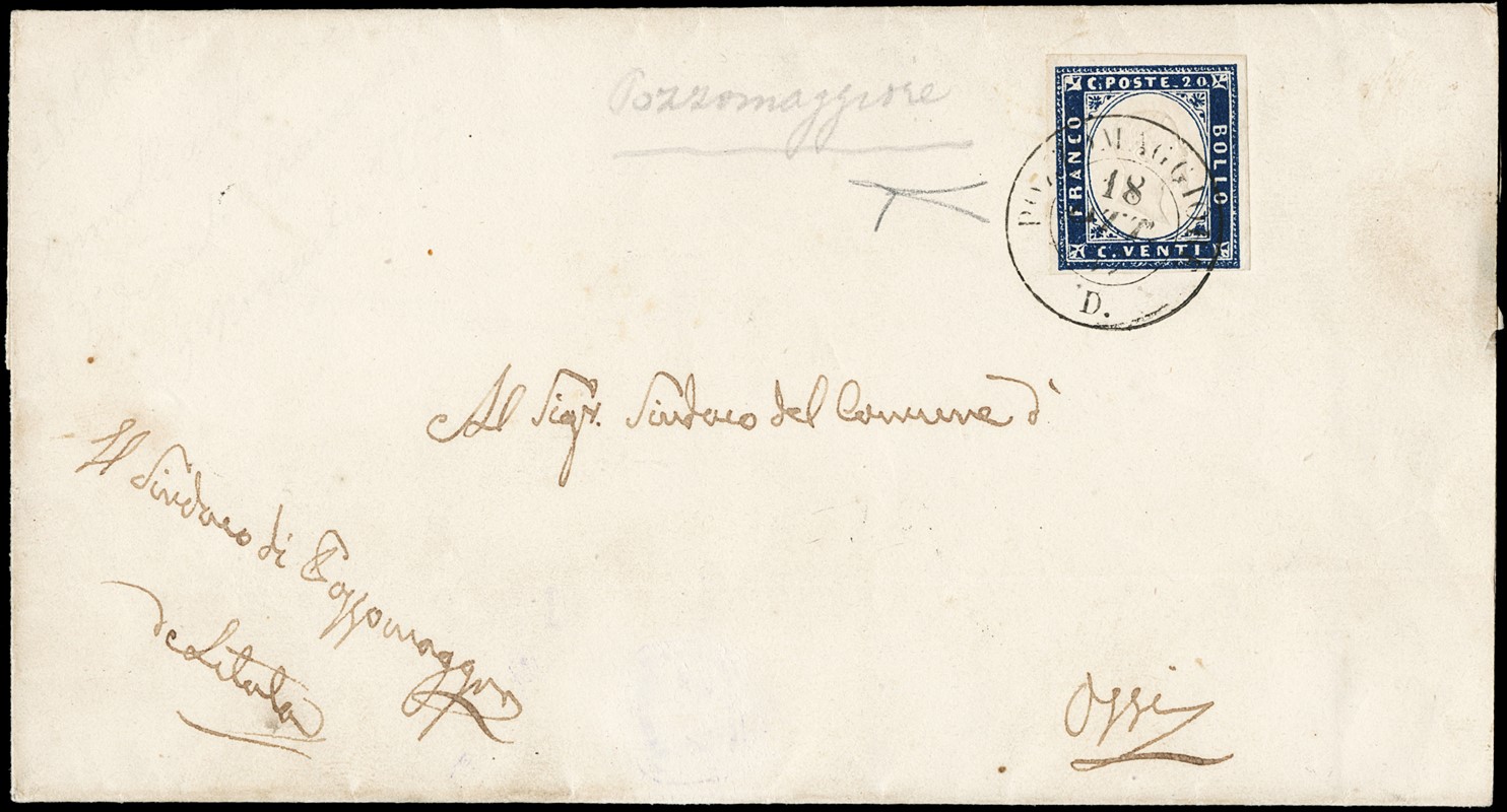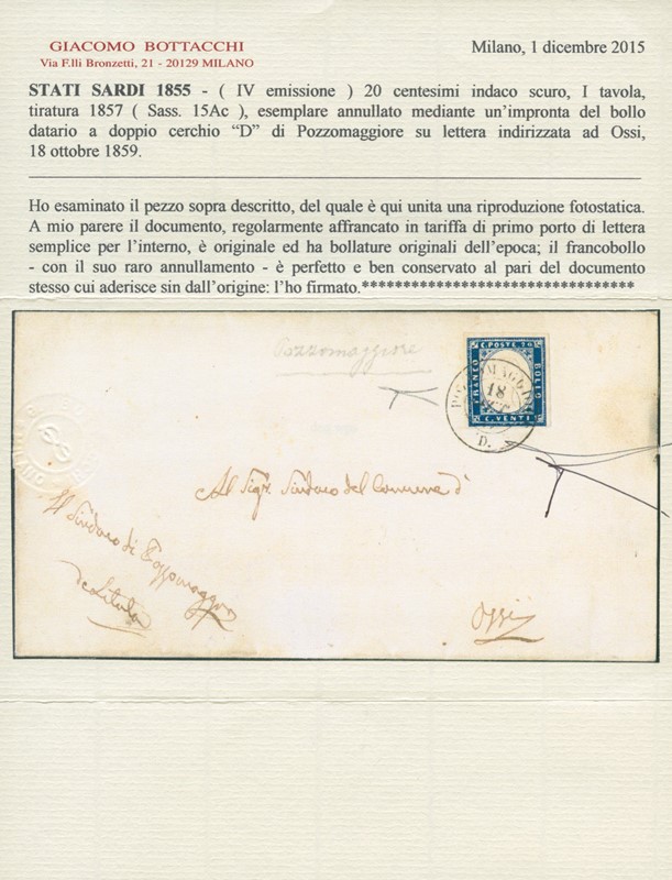 1857 - 20c indaco da 'POZZOMAGGIORE 18 OTT 57' (Isola di Sardegna, SS) a Ossi. Annullo raro, insieme splendido. CF Bottacchi (Sassone 15Ab+pt.13 - Euro 12.000+)