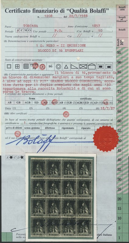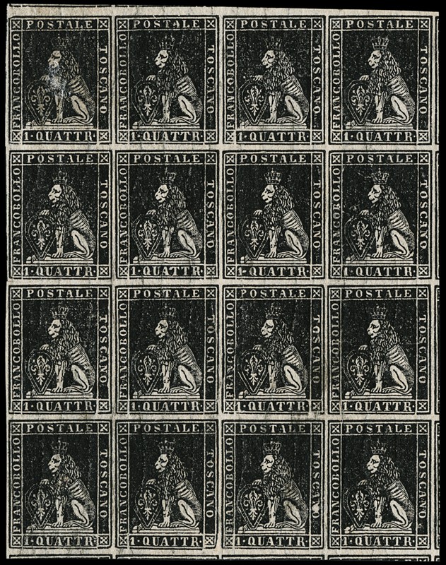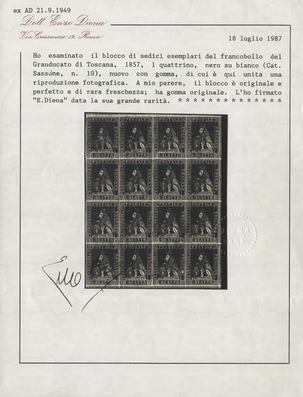 1857 - II emissione, 1q nero, blocco di sedici, nuovo con piena gomma, dieci SL. Splendida rarita'. Firme Grioni, A.Diena, CF E.Diena e CF finanziario Bolaffi 100%: '...il piu' grande blocco conosciuto eccezion fatta per il foglio completo ex coll. Rotschild' (Sassone 10 - circa Euro 107.500+)