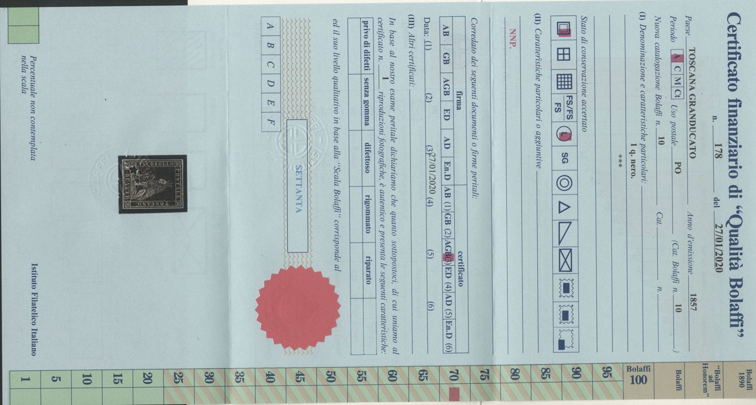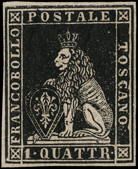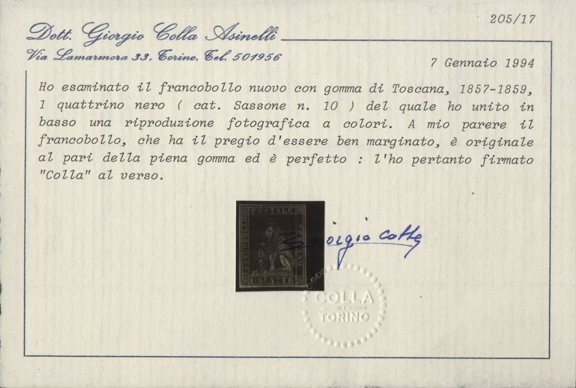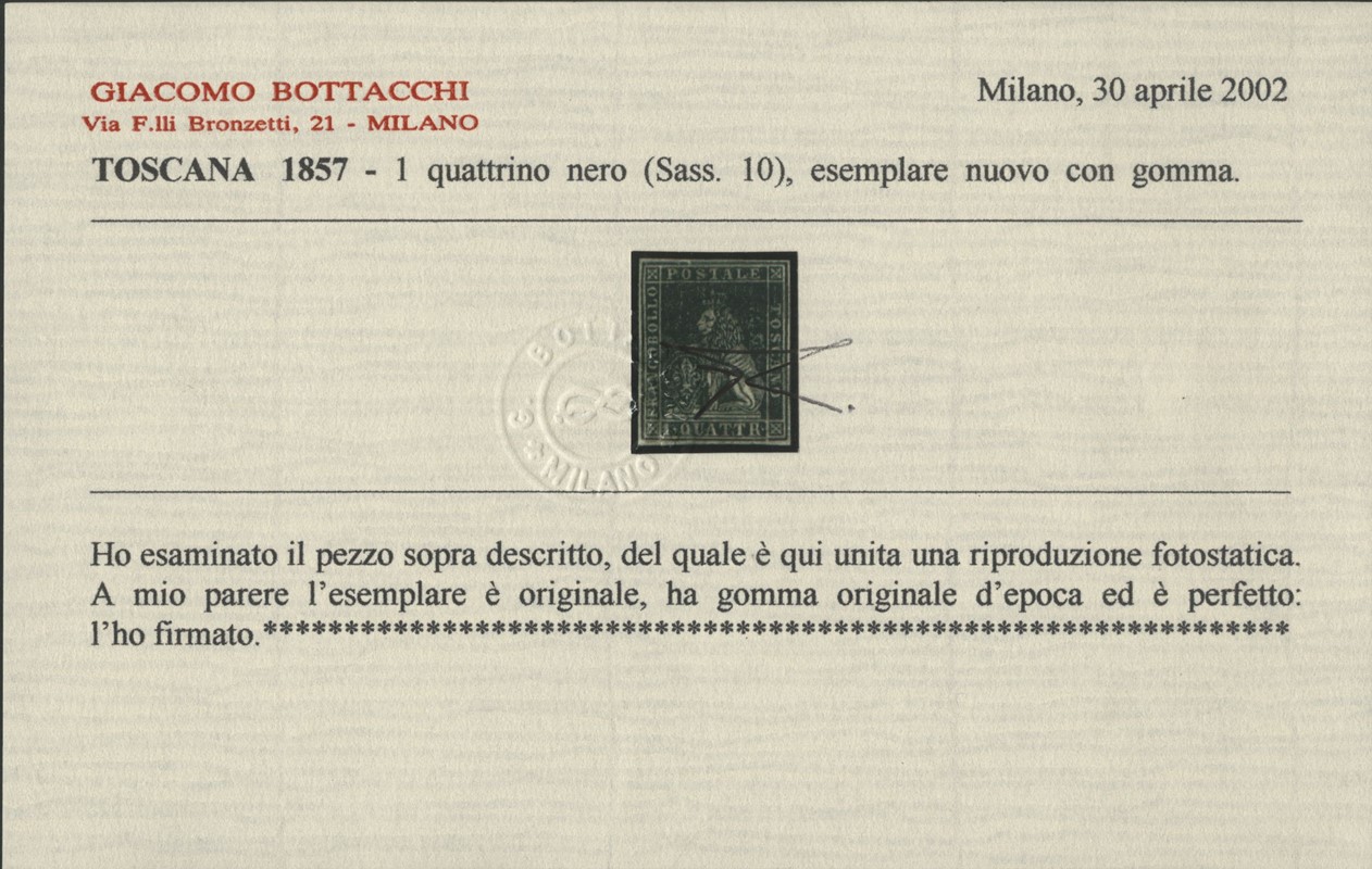 1857 - II emissione, 1q nero, nuovo con gomma, margini bianchi. CF Bolaffi 70%, Bottacchi e Colla (Sassone 10 - Euro 3.750)