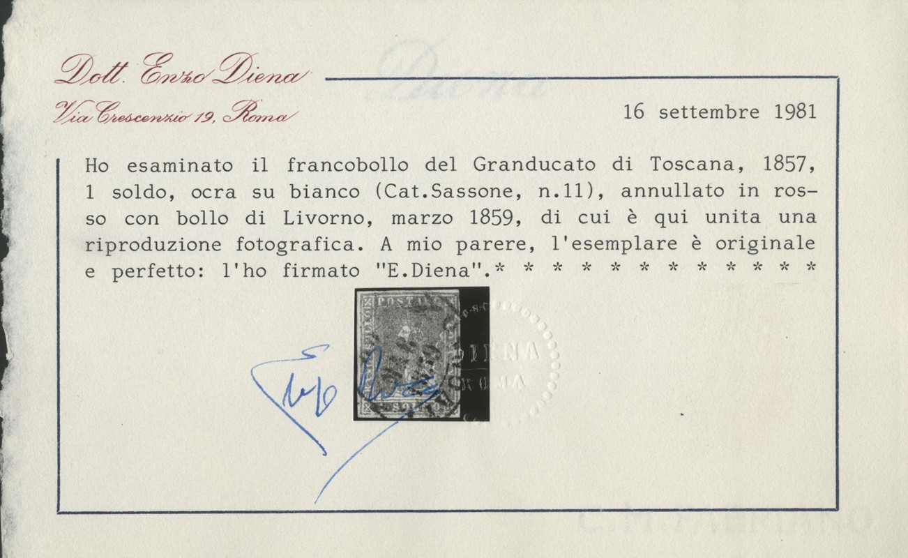 1857 - II emissione, 1s ocra con margini bianchi e annullo rosso di Livorno. Timbrino Fulpius, CF E.Diena (Sassone 11 - Euro 12.000)