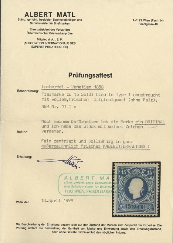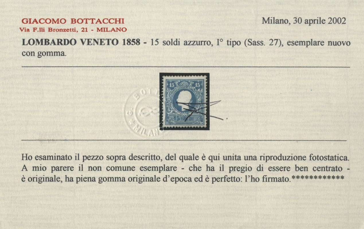 1858 - 15c azzurro, I tipo, nuovo con gomma. CF Bottacchi e Matl (Sassone 27 - Euro 32.000)
