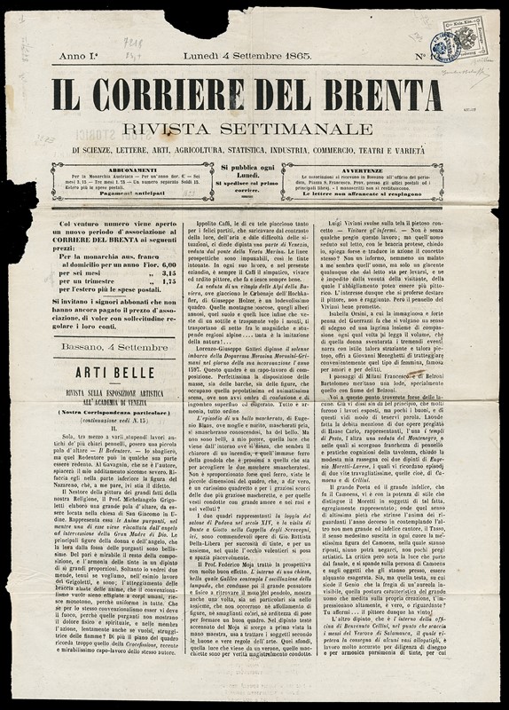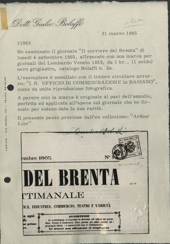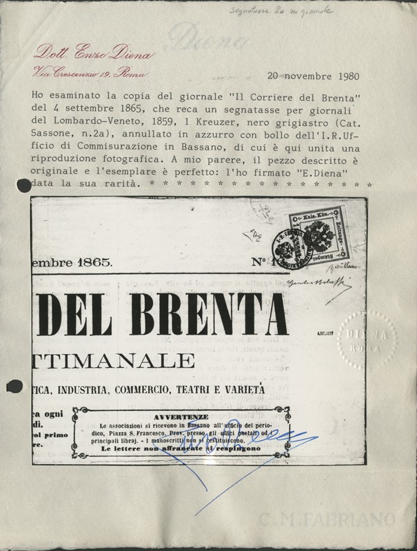 1858 - 1kr nero grigio con ampi margini su 'Il corriere del Brenta' del 4 Settembre 1865 annullato con bollo a ditale azzurro di Bassano. Firme Mondolfo e Muller, CF E.Diena e Giulio Bolaffi (Sassone STG2a+pt.9 - Euro 66.800)