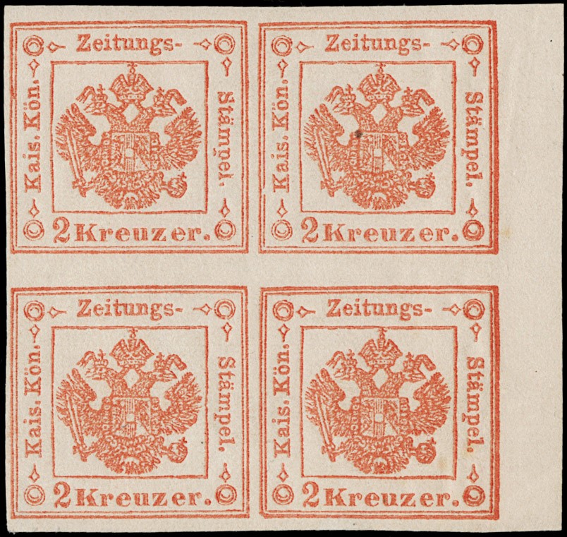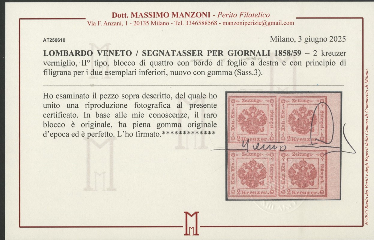 1858 - 2kr vermiglio BL4 BdF, piena gomma. Sigla E.Diena, CF Manzoni (Sassone STG3 - Euro 8.000+)