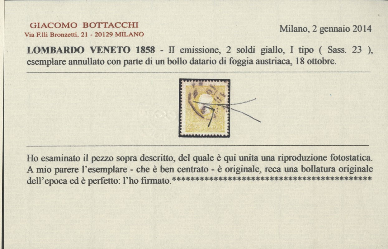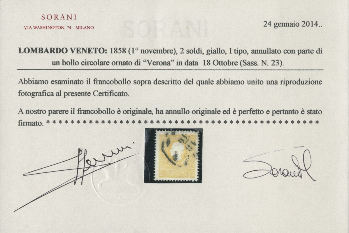 1858 - 2s giallo I tipo e 3s nero grigio I tipo, usati. CF Sorani, Bottacchi e Raybaudi (Sassone 23+24a - Euro 2.000)