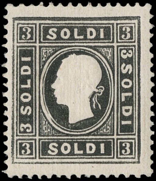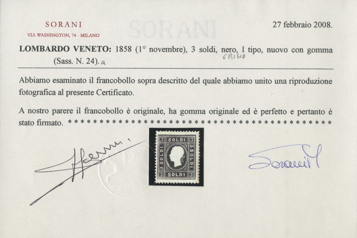 1858 - 3c nero, I tipo, nuovo con gomma. Sigla E.Diena, CF Sorani (Sassone 24 - Euro 16.000)