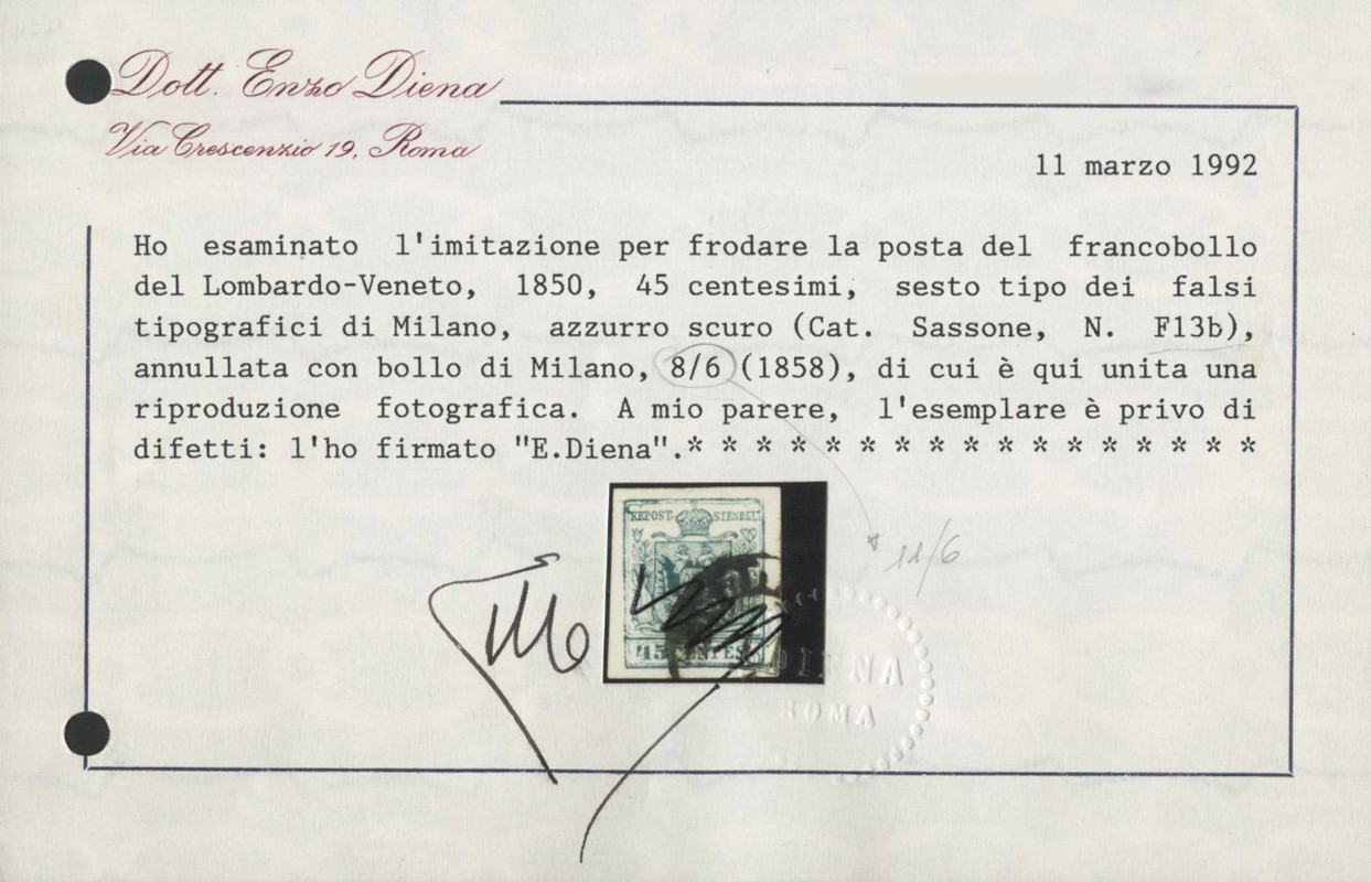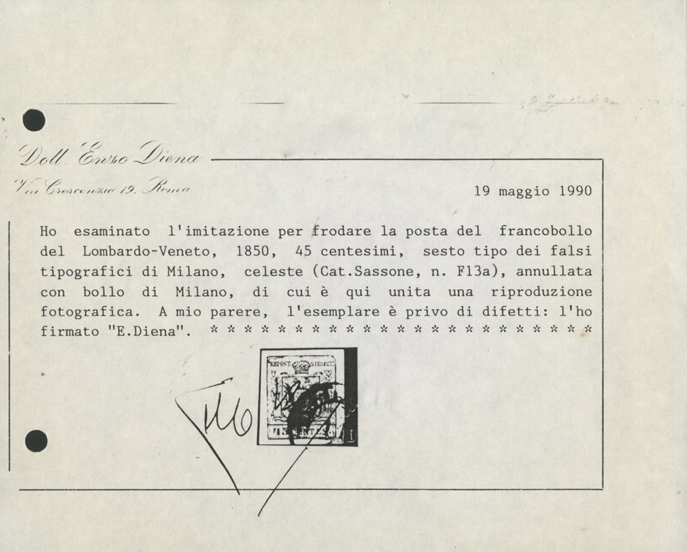 1858 - 45c azzurro scuro imitazione tipografica di Milano, VI tipo, con grandi margini, annullato 'MILANO 11'. Firma Fiecchi, CF E.Diena (Sassone F13b - Euro 16.000)