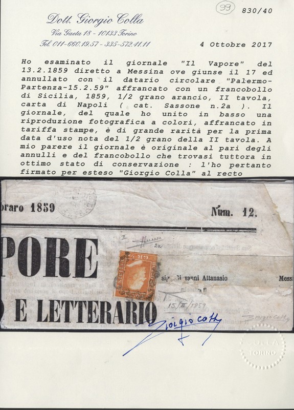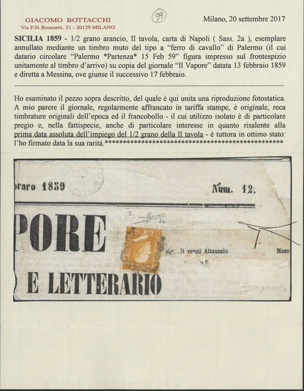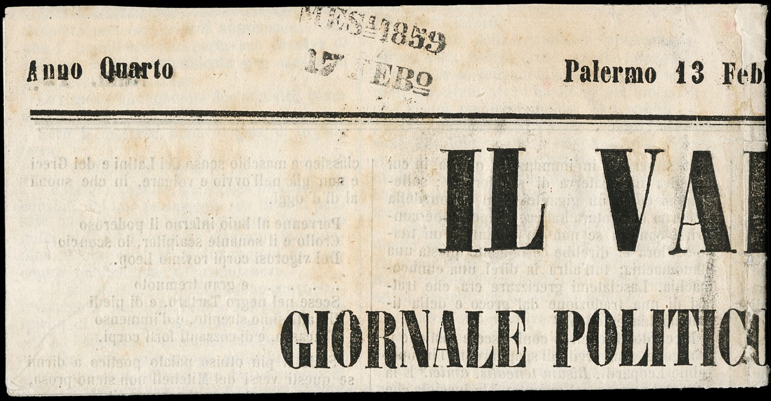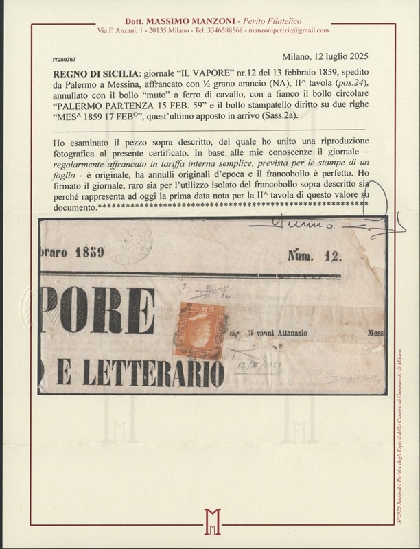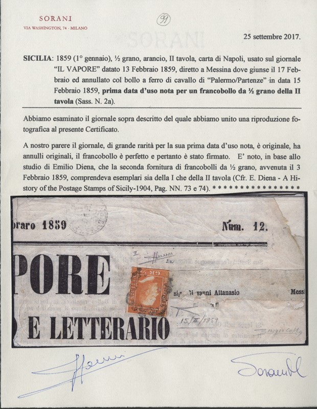1859 - 1/2gr arancio (NA), II tav, perfetto, su giornale 'IL VAPORE' Palermo a Messina il 13 febbraio 1859. Prima data nota per il 1/2 grano della II tavola. Rarita'. CF Sorani, Colla, Bottacchi e Manzoni (Sassone 2a - Euro 46.875++)