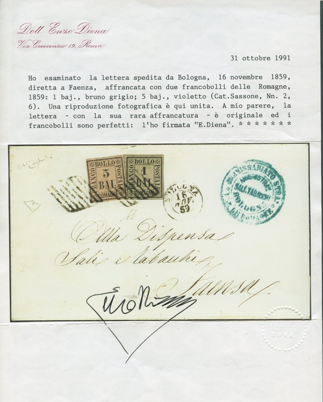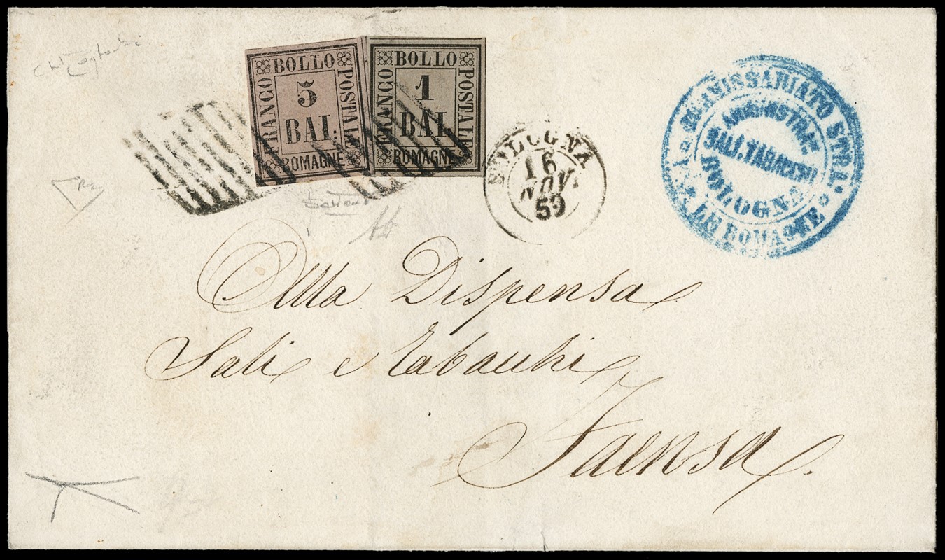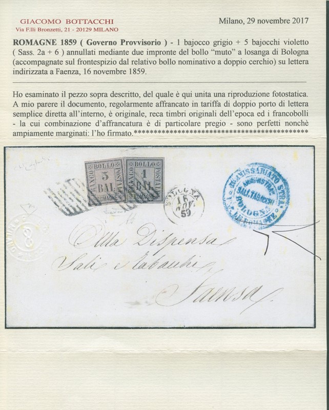 1859 - 1b bruno grigio e 5b violetto, da 'BOLOGNA 15 NOV 59' per Faenza. Rarissima affrancatura bicolore. Firme Raybaudi e A.Diena, CF Bottacchi ed E.Diena (Sassone 2+6 - Euro 20.000)