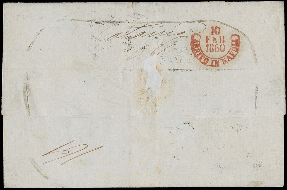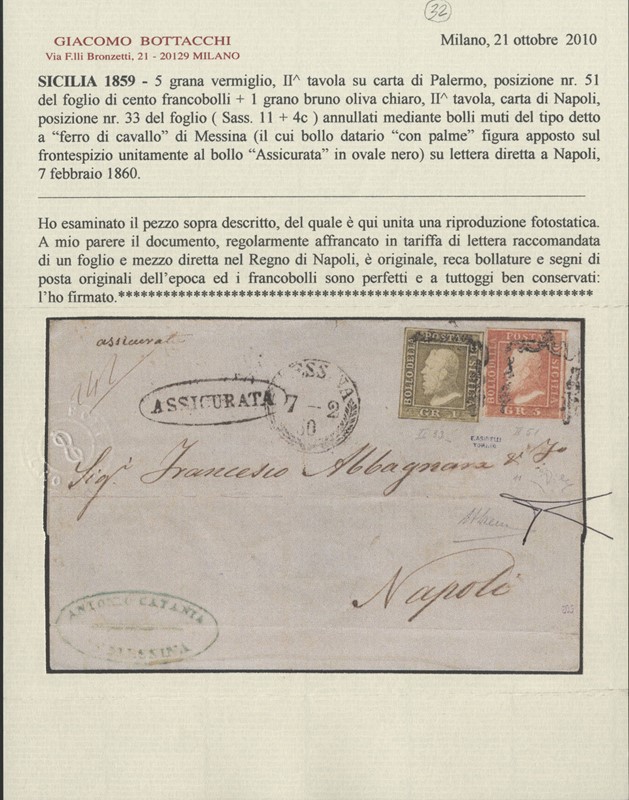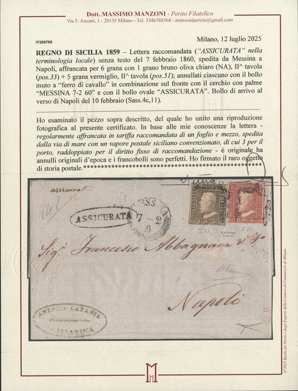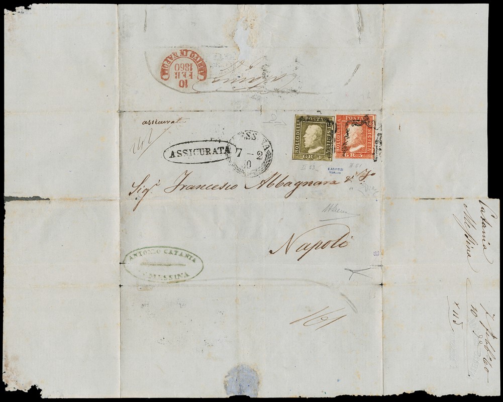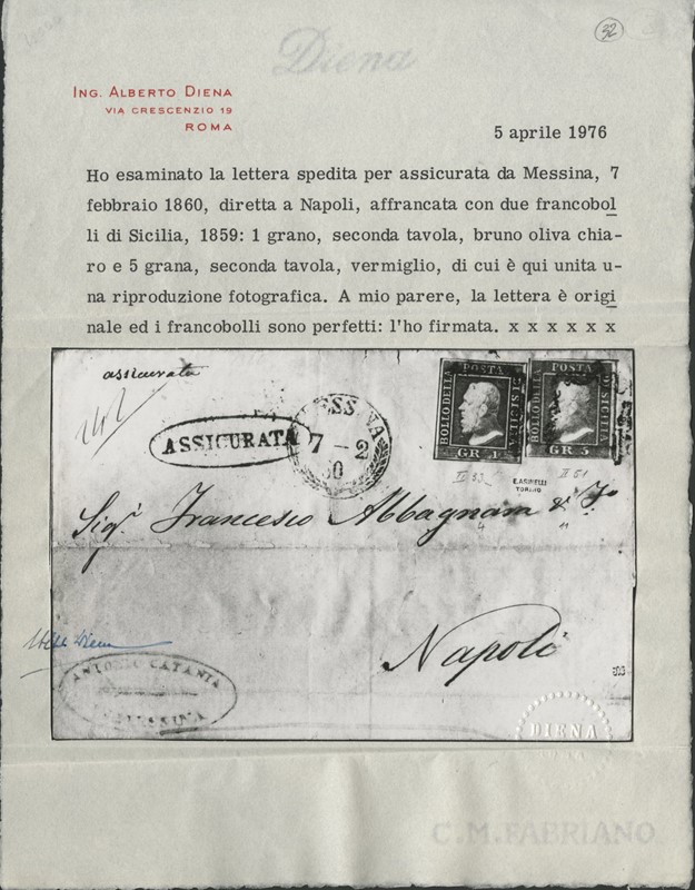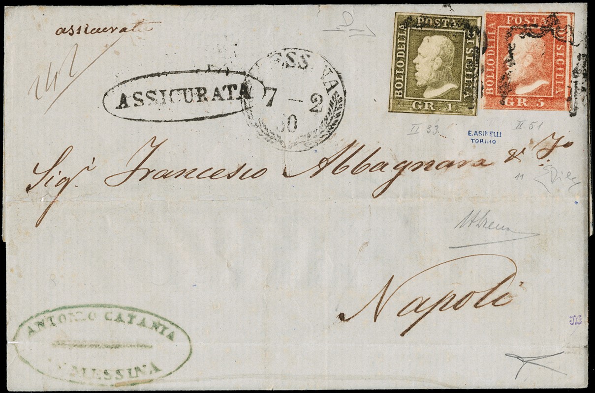 1859 - 1gr bruno oliva chiaro II tav (pos.33) e 5gr vermiglio II tav (pos.51), su 'ASSICURATA' da 'MESSINA 7 - 2 60' a Napoli. Rara affrancatura con francobolli perfetti. Non riportata nell'elenco delle affrancature del catalogo Sassone. Firma E.Diena, timbrino Asinelli, CF A.Diena, Bottacchi e Manzoni (Sassone 4c+11 - Euro 42.900+)