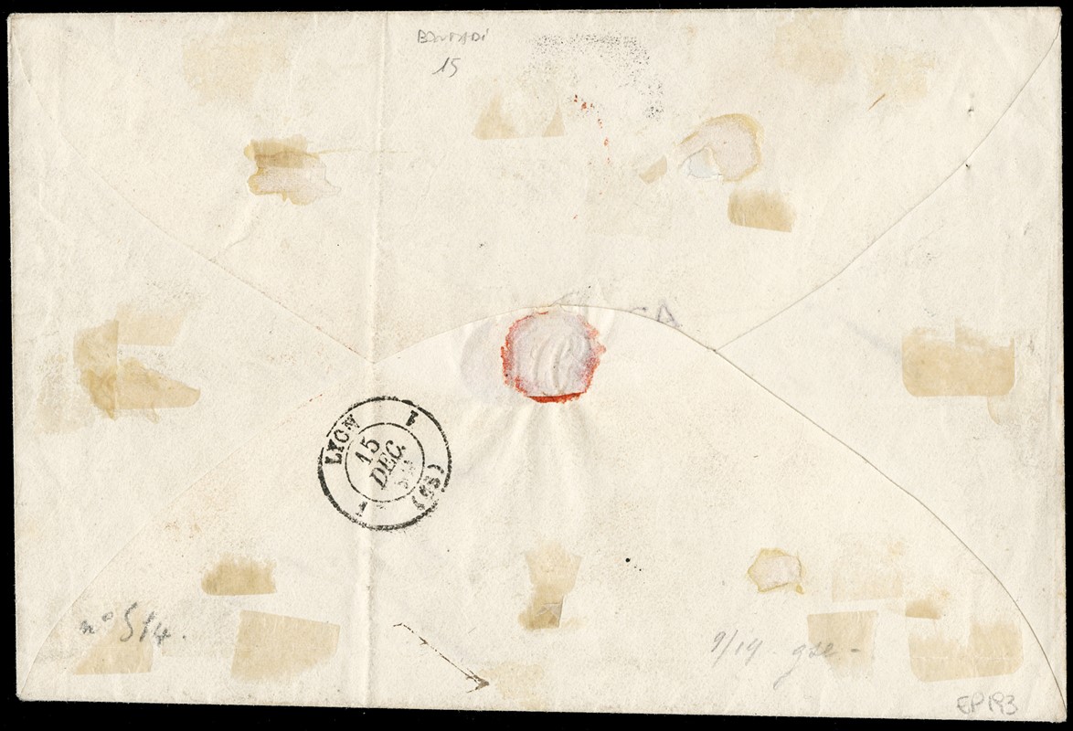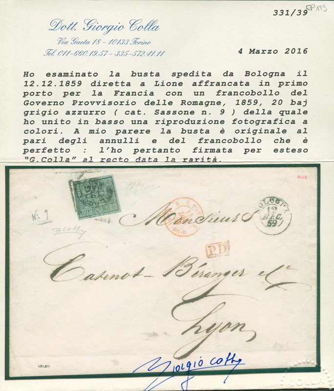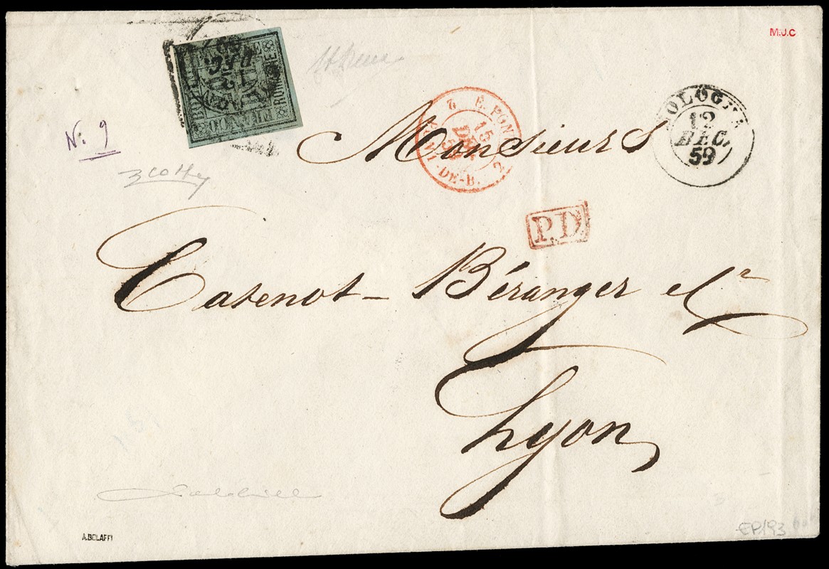 1859 - 20b grigio azzurro (a filo in alto a destra), da 'BOLOGNA 15 DEC 59' per Lyon, Francia. Raro uso isolato. Firma A.Diena, CF Colla (Sassone 9 - Euro 50.000)