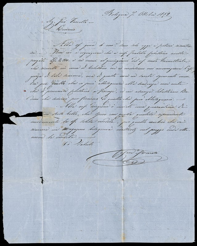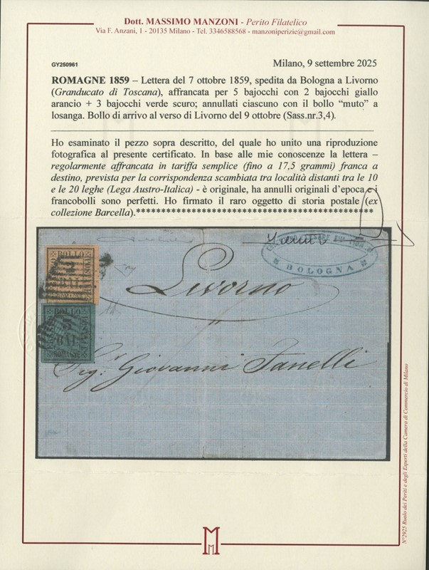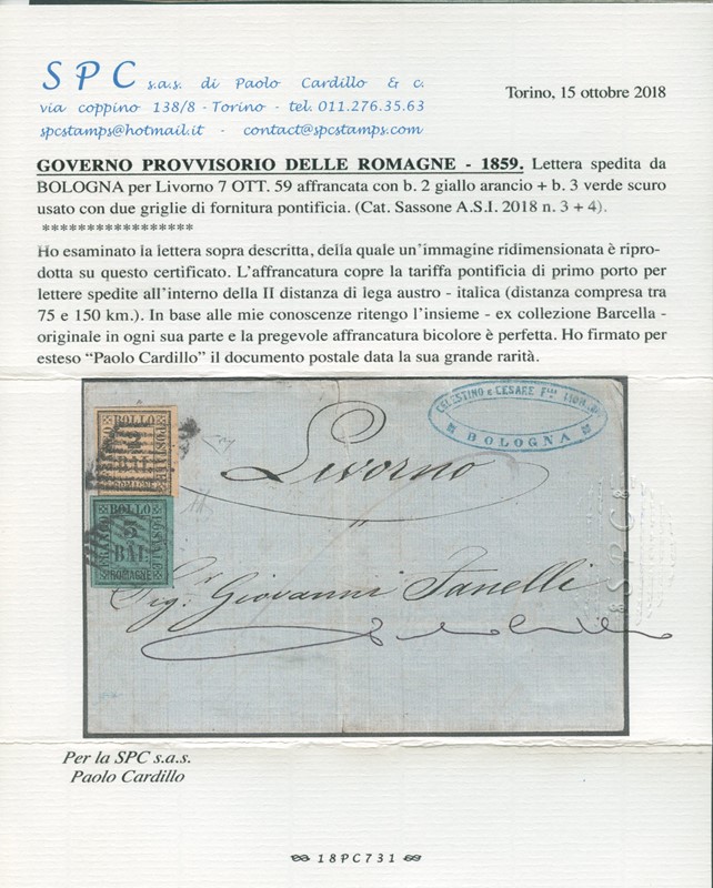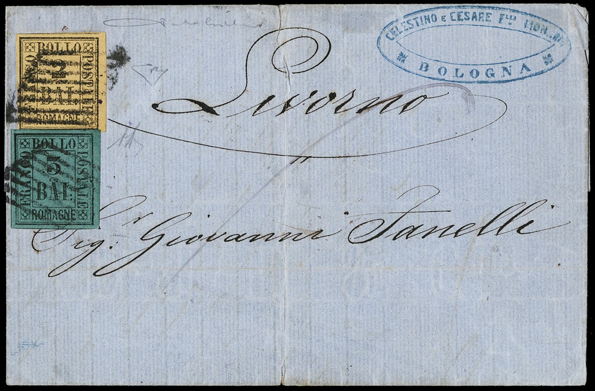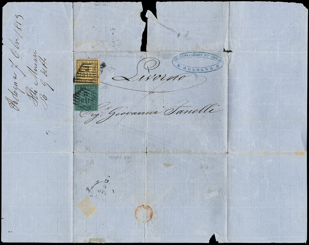 1859 - 2b giallo arancio BdF e 3b verde scuro, da 'BOLOGNA 7 ottobre 59', per Livorno. Rarissima affrancatura bicolore. Ex Barcella, CF Cardillo e Manzoni (Sassone 3+4 - Euro -)