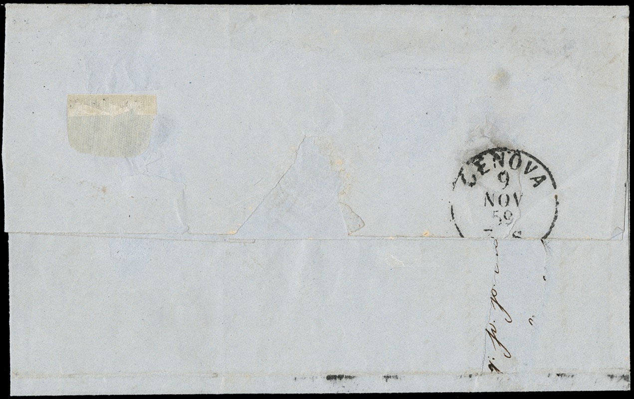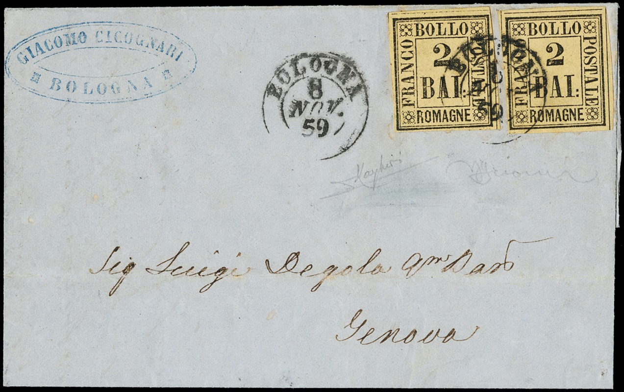 1859 - 2b giallo arancio, due esemplari da 'BOLOGNA 8 NOV. 59' a Genova. Firme Grioni e Raybaudi (Sassone 3 - Euro 4.500++)