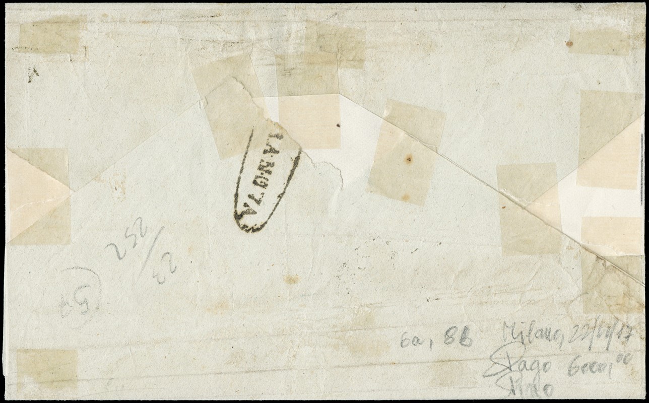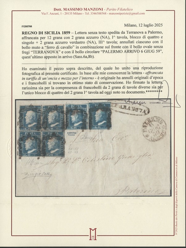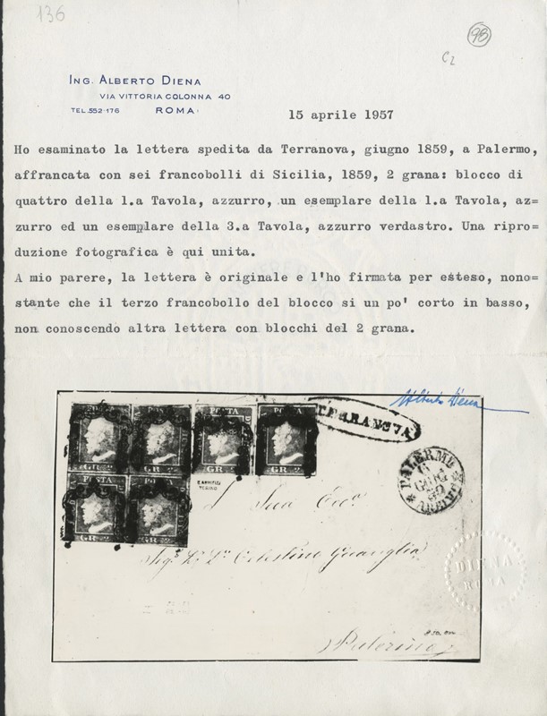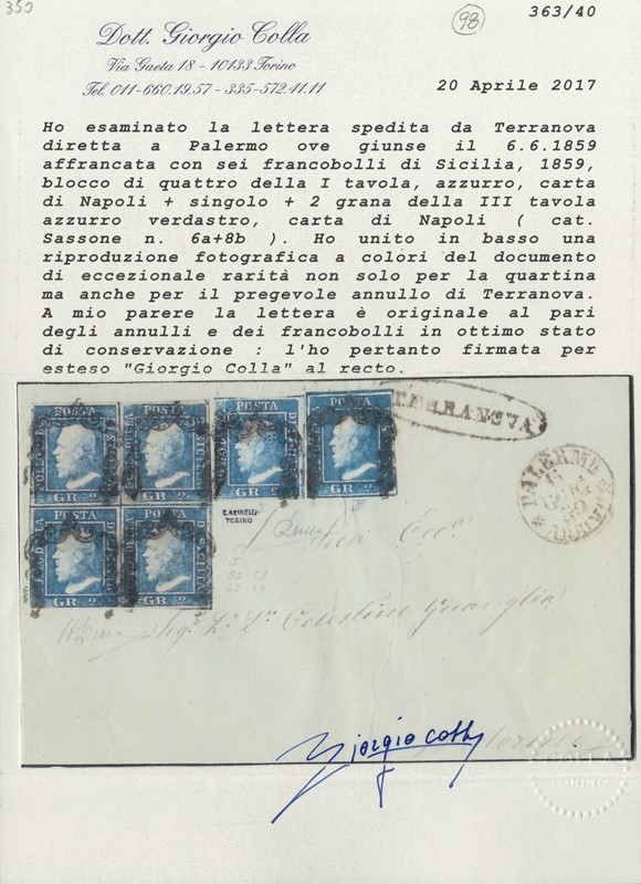 1859 - 2gr azzurro (NA) I tav, BL4 (appena sfiorato in basso) e singolo con 2gr azzurro verdastro III tav, da 'TERRANOVA' a Palermo. Lettera rarissima sia per l'uso di due diverse tavole del 2 grana, sia perche' e' l'unico blocco di quattro del 2 grana I tavola a oggi noto su documento. Firma Gaetano Russo, CF A.Diena, Colla e Manzoni (Sassone 6a+8b - Euro - )