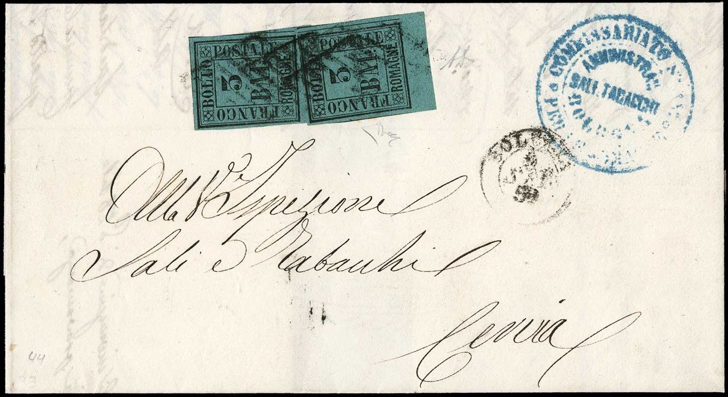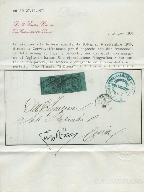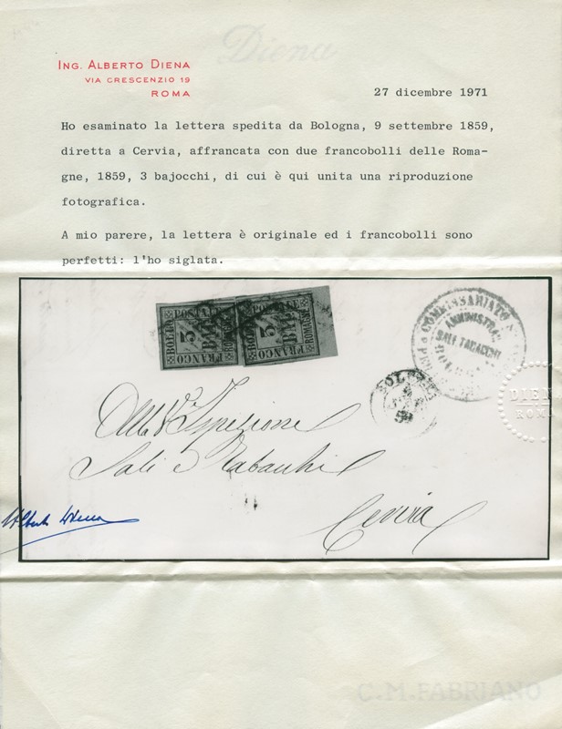1859 - 3b due esemplari entrambi BdF inferiore, da 'BOLOGNA 9 SET 59' per Cervia. Splendida e rara affrancatura da 6 bajocchi. CF A. ed E.Diena (Sassone 4 - Euro 10.000++)