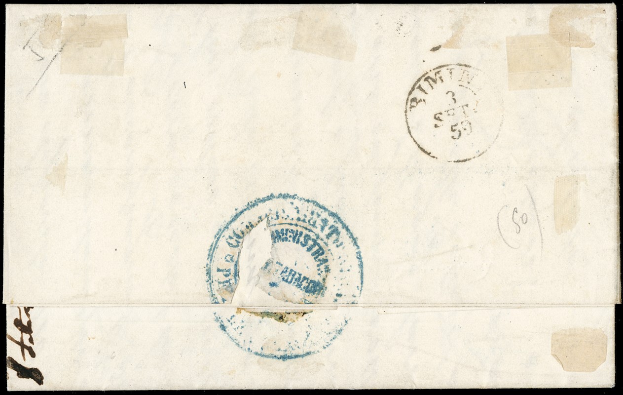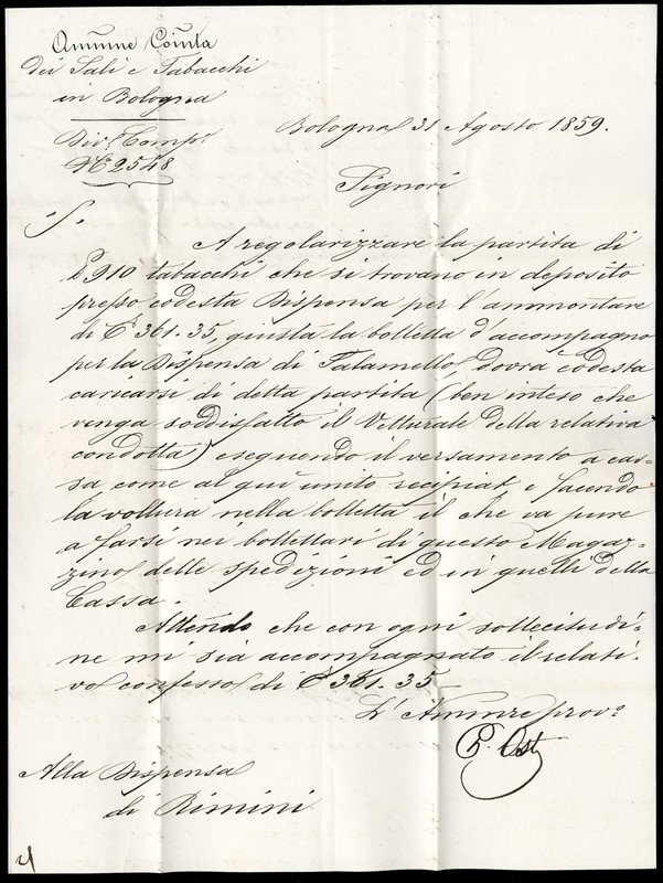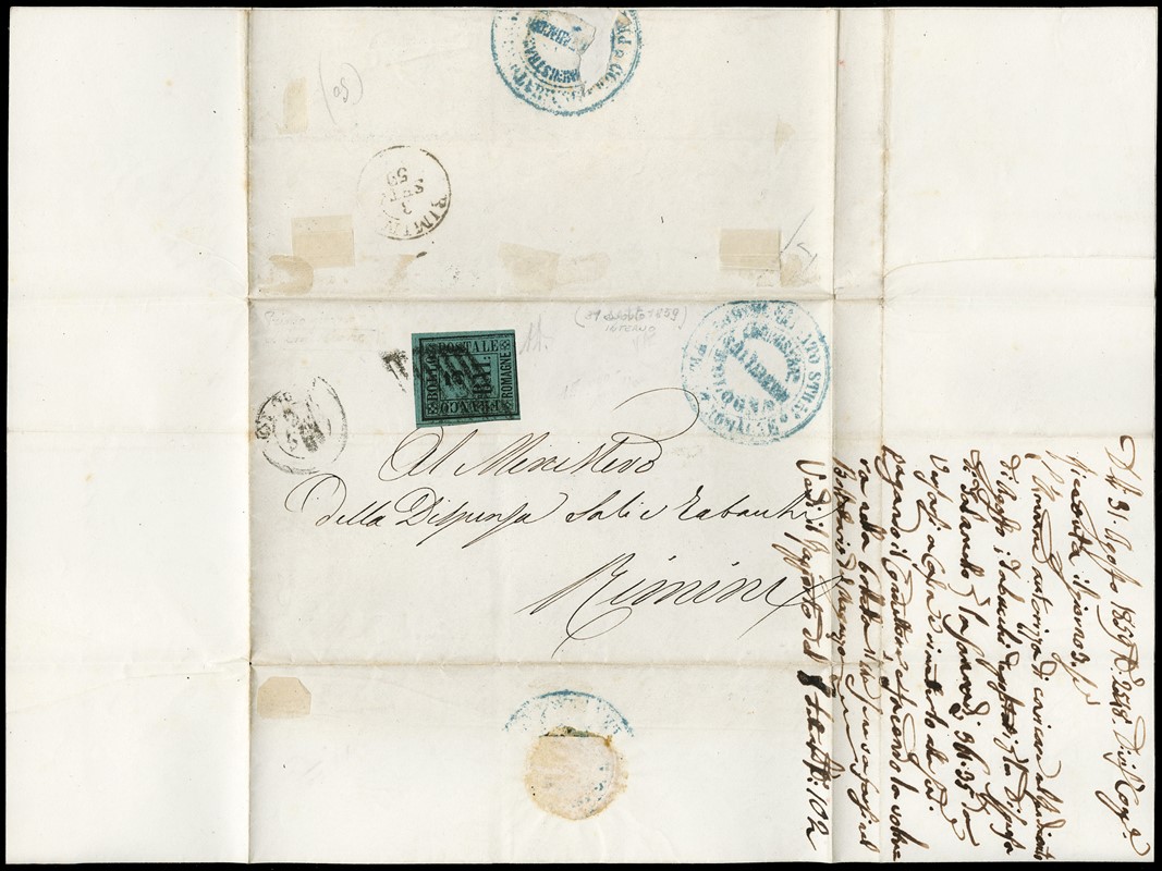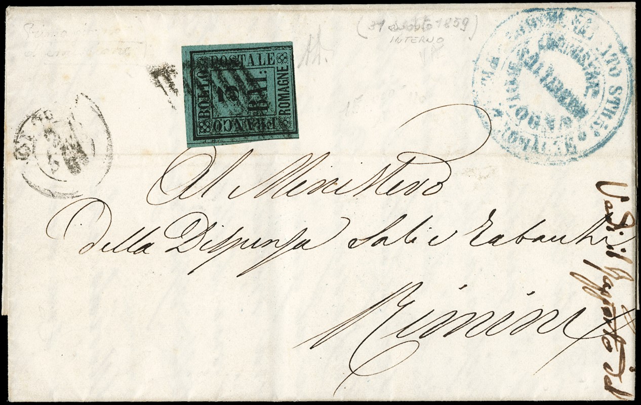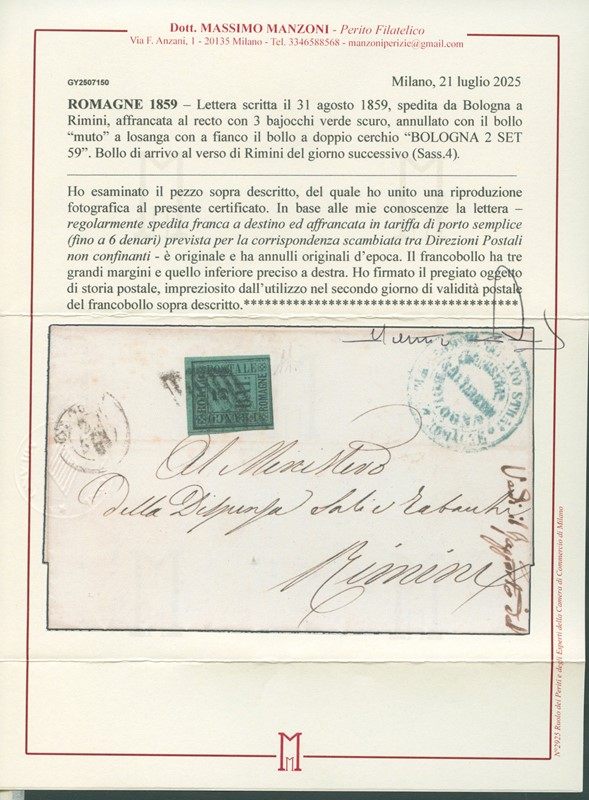 1859 - 3b verde scuro, uso isolato da 'BOLOGNA 2 SET 59' (datata 31 agosto all'interno) per 'RIMINI 2 SET 1859'. II giorno d'uso dei francobolli del Governo Provvisorio delle Romagne. Francobollo a filo in un punto in basso a destra, insieme molto interessante e raro. Sigla A.Diena e CF Manzoni (Sassone 4 - Euro 5.000++)