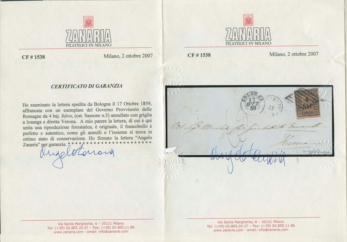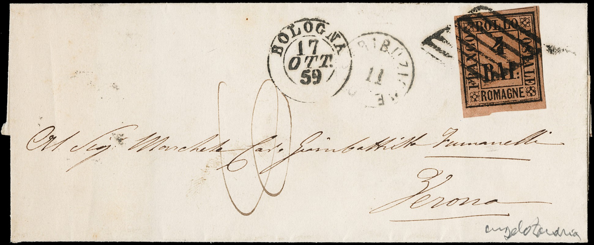 1859 - 4b fulvo BdF, da 'BOLOGNA 17 OTT 59' per Verona. Tinta molto viva. Splendida. CF Zanaria (Sassone 5 - Euro 1.625+)