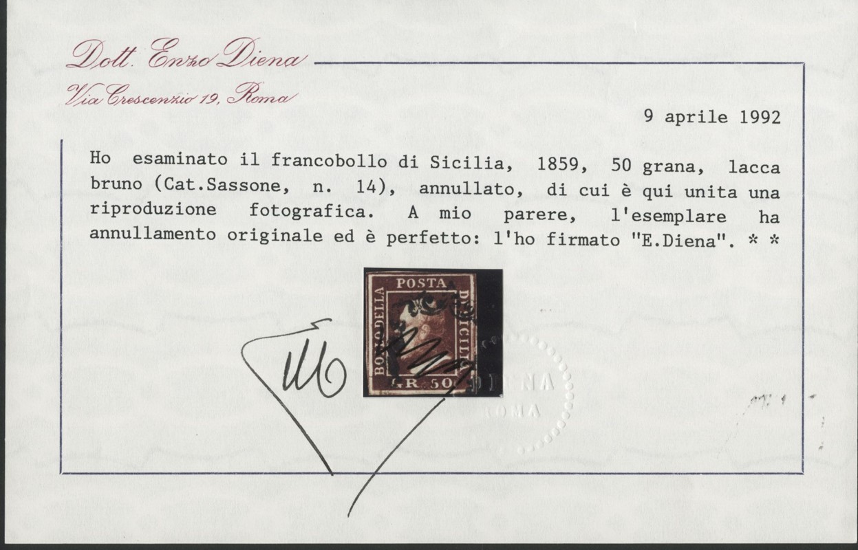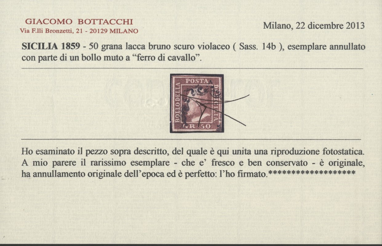1859 - 50gr lacca bruno scuro violaceo. CF E.Diena