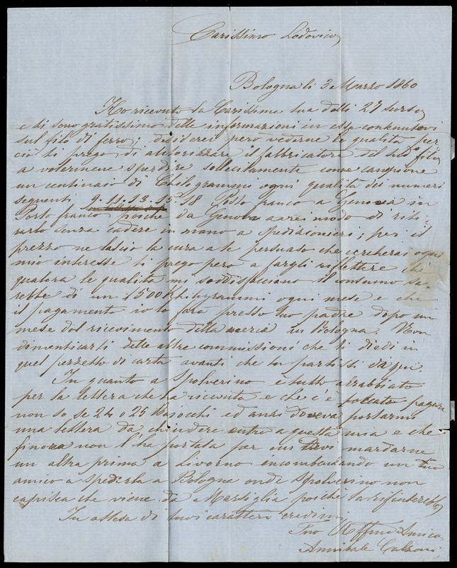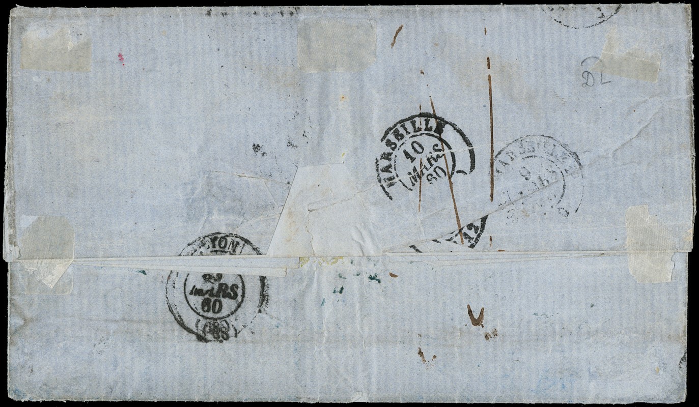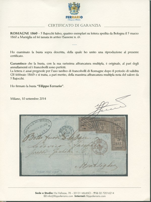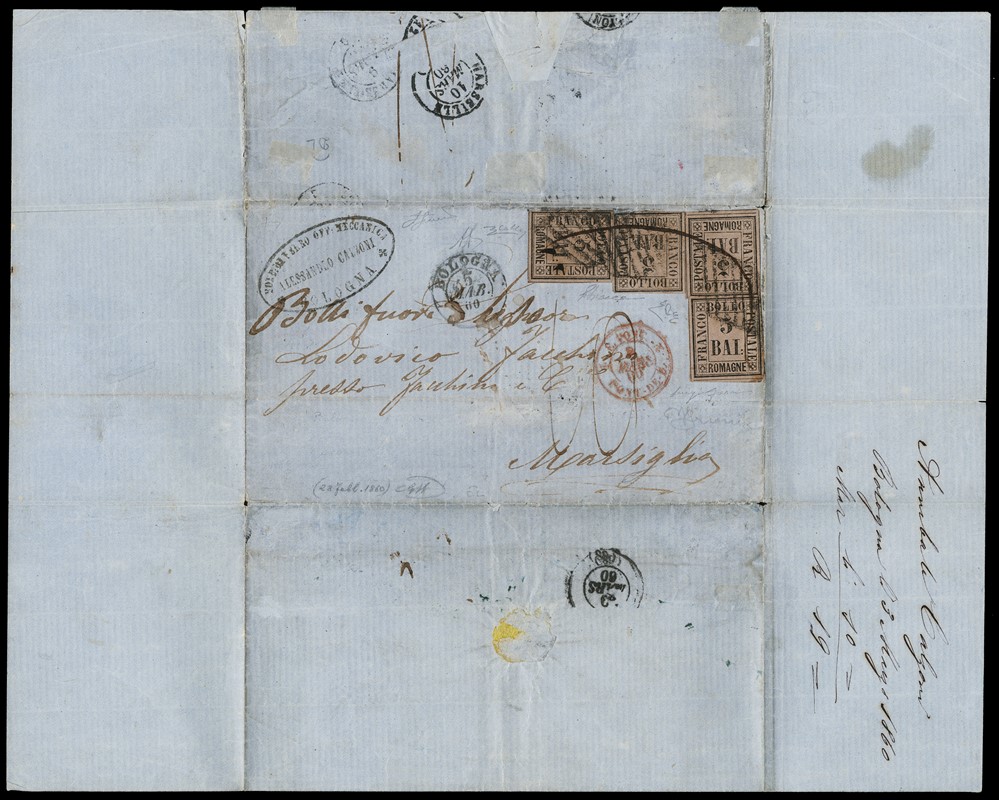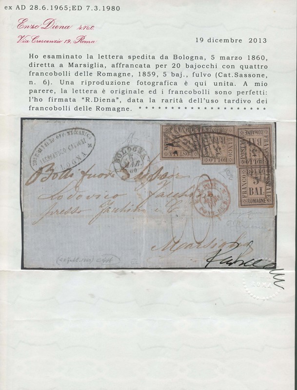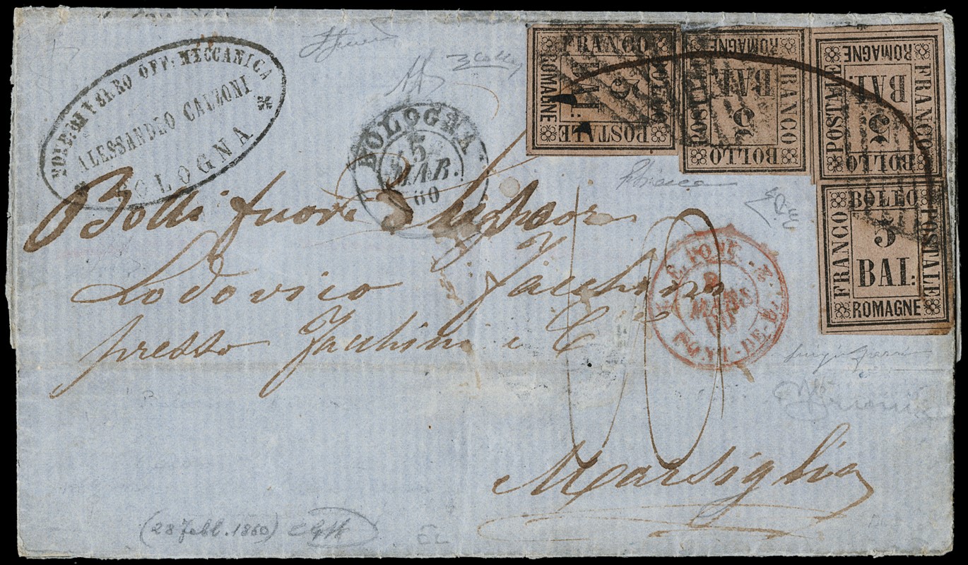 1859 - 5b violetto, quattro esemplari da 'BOLOGNA 5 MAR 60' per Marsiglia. Uso tardivo dei francobolli di Romagna, dopo il periodo di validita', e massimo multiplo noto del 5b su lettera. Oggetto di grande interesse storico postale e rarita'. CF Diena e Ferrario (Sassone 6 - Euro -)