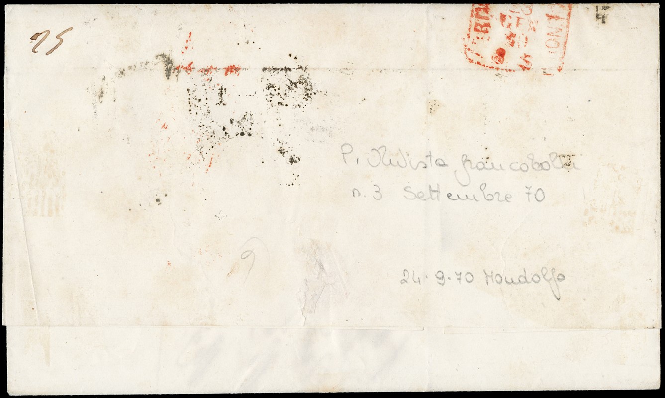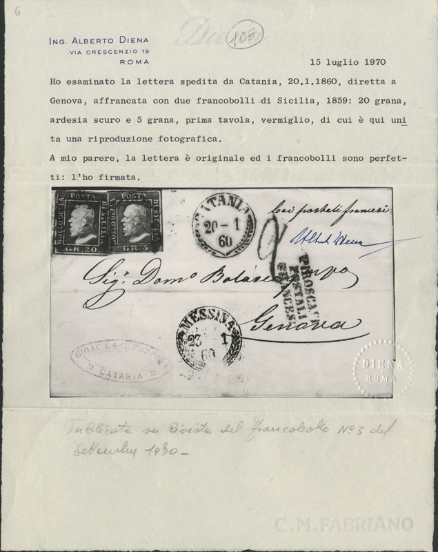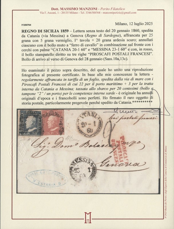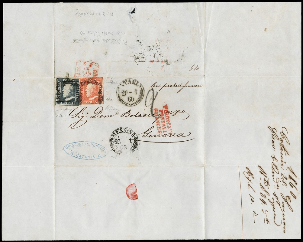 1859 - 5gr vermiglio I tav e 20gr ardesia scuro, da 'CATANIA 20 - 1 60' via Messina a Genova. Rara affrancatura con francobolli perfetti. Firma Alberto Bolaffi, CF A.Diena e Manzoni (Sassone 10+13c - Euro 56.500 / come affrancatura Euro 87.500)