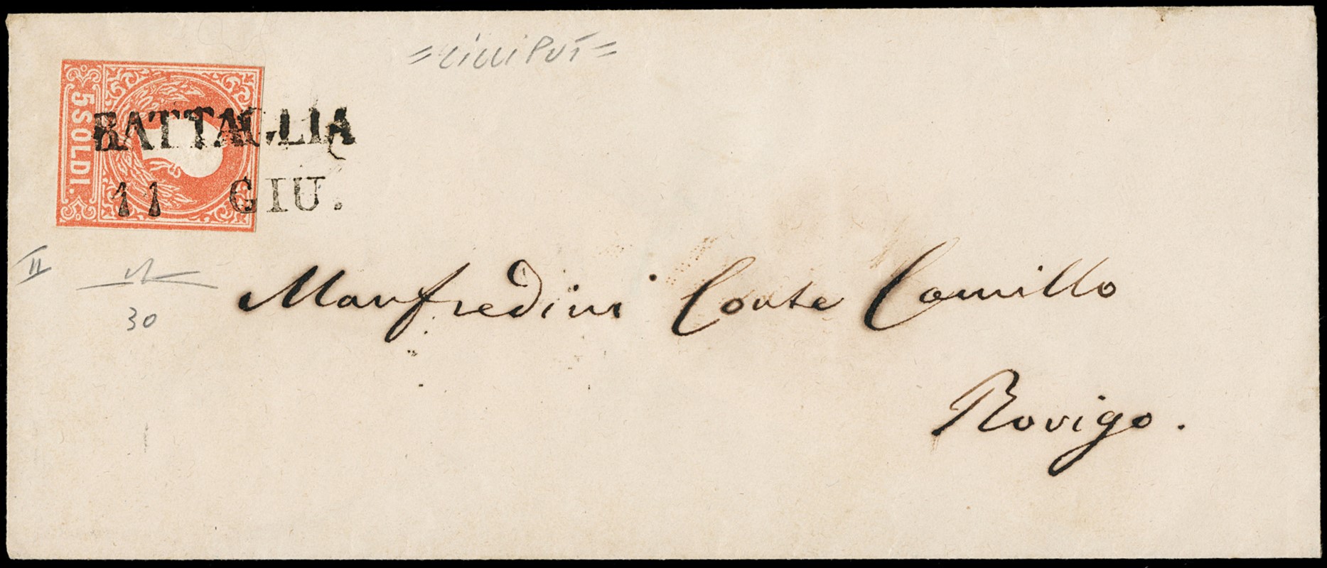 1859 - 5s rosso II tipo, con dentellatura tagliata sui quattro lati “lilliput', da “BATTAGLIA 11 GIU.' a Rovigo. Sigla Manzoni (Sassone 30 - Euro -)