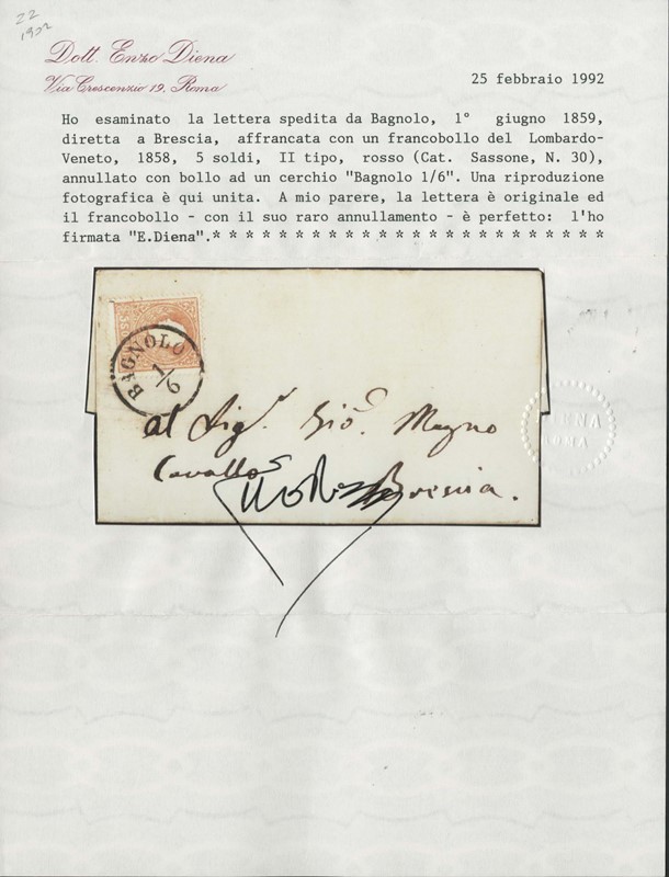 1859 - 5s rosso II tipo da 'BAGNOLO 1/6' (1859) a Brescia. Annullo molto raro in periodo bellico, splendido. CF E.Diena (Sassone 30+pt.R1 - Euro 22.500)