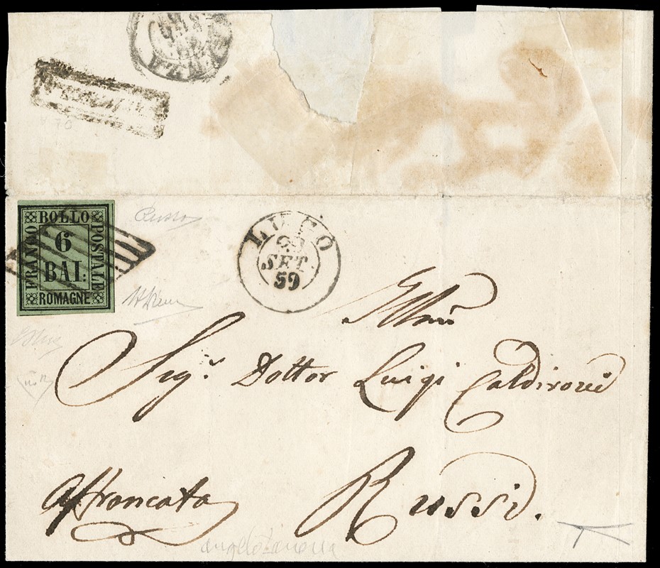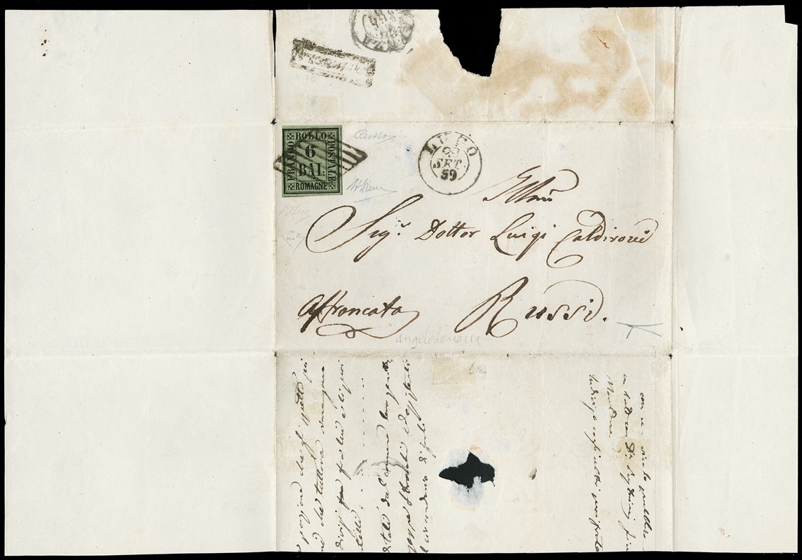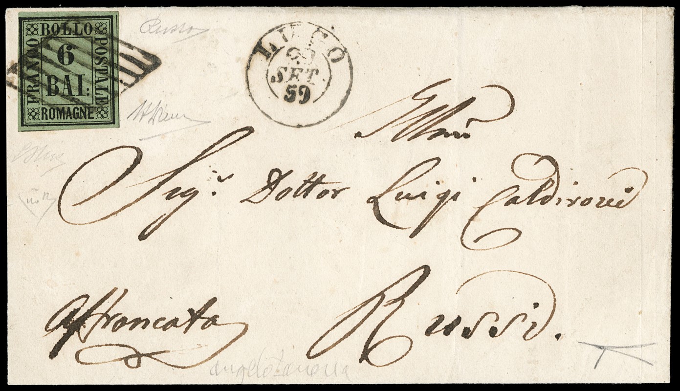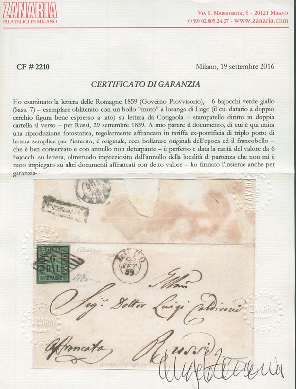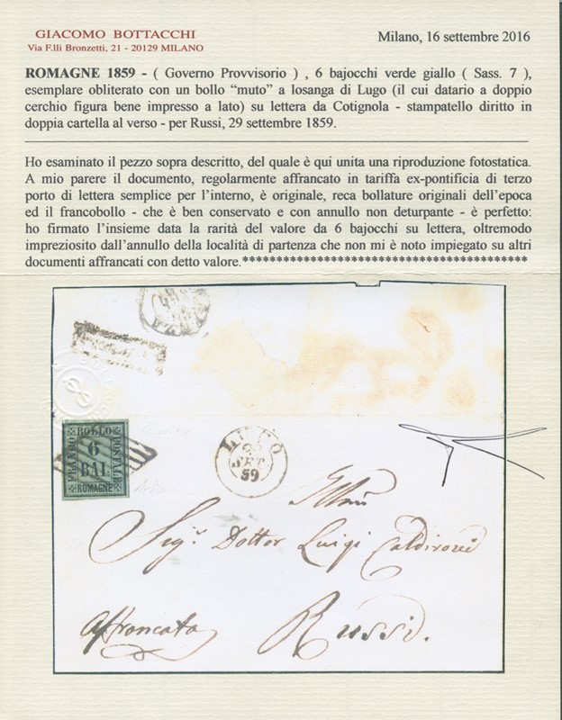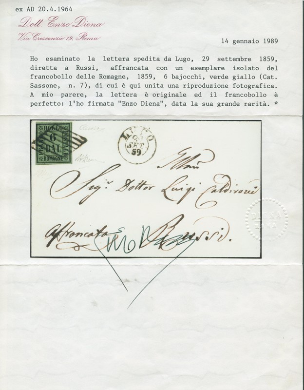 1859 - 6b verde giallo, annullato con griglia di 'LUGO 29 SET 59' da 'COTIGNOLA' (SD in cartella al verso - pt.R3) per Russi. Rarissima e splendida. Firme A.Diena e Russo, CF Bottacchi, E.Diena e Zanaria (Sassone 7+pt.R3 - Euro 160.000+35.000/55.000)