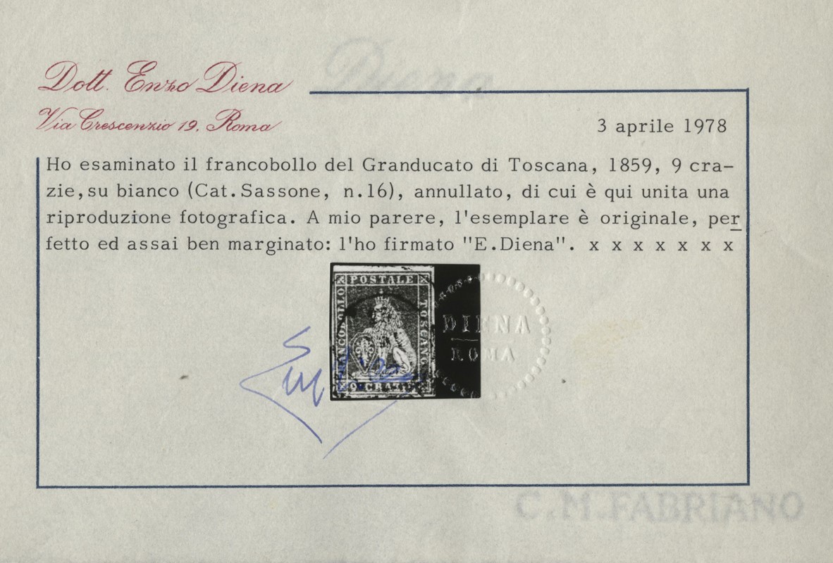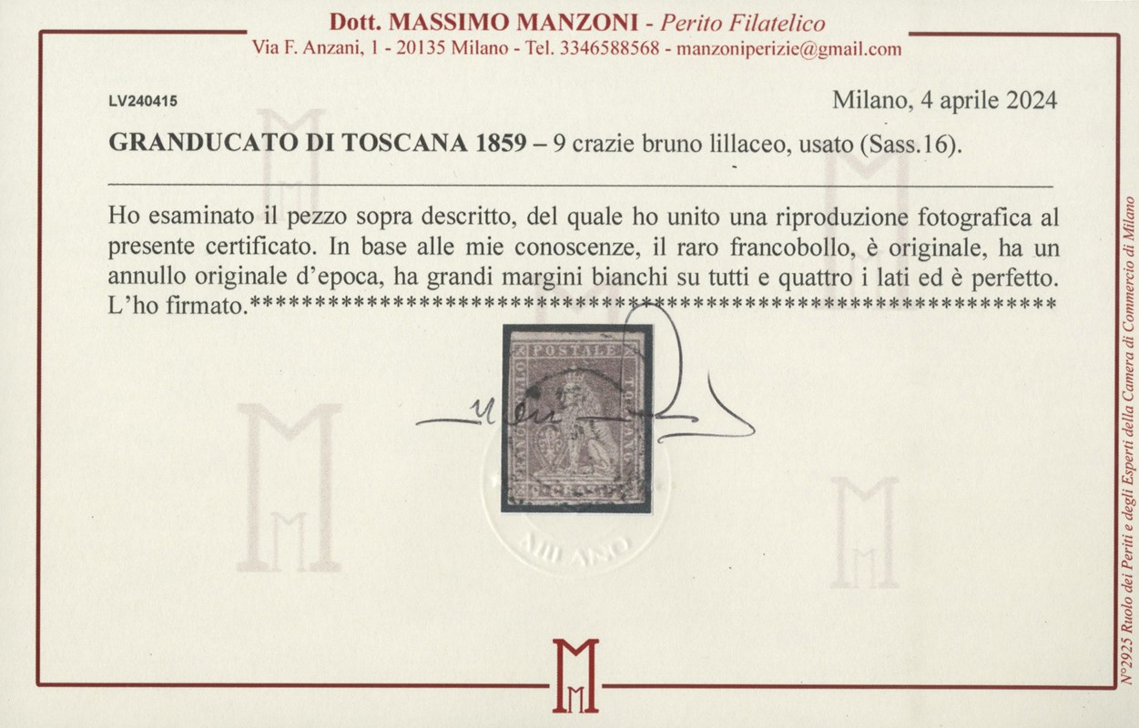 1859 - 9cr bruno lillaceo con grandi margini. Perfetto, raro. Firma Em.Diena, CF E.Diena e Manzoni (Sassone 16 - Euro 12.000)
