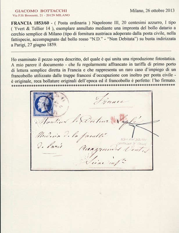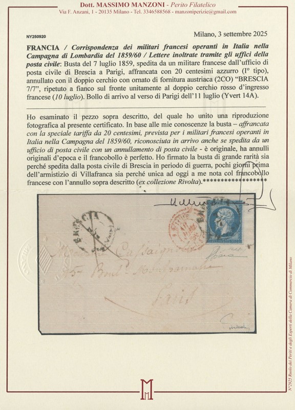 1859 - Francia Napoleone III, 20c celeste (Yvert 14) da 'BRESCIA 7/7' (2CO - 1859) a Parigi. Rarissima, citata nel cat.Sassone Annulli p.699 'unica lettera nota con questo annullo'. Splendida, firma Alberto Bolaffi, CF Bottacchi e Manzoni (Sassone pt.R4 - Euro 90.000++)