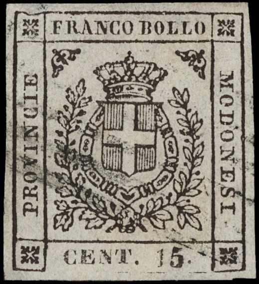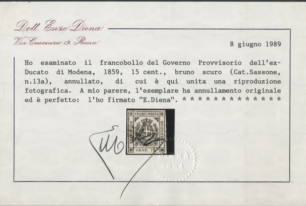 1859 - Governo Provvisorio, 15c bruno scuro, annullo leggero. Raro. Firma Em.Diena, CF E.Diena (Sassone 13a - Euro 7.000)