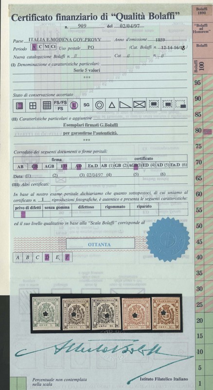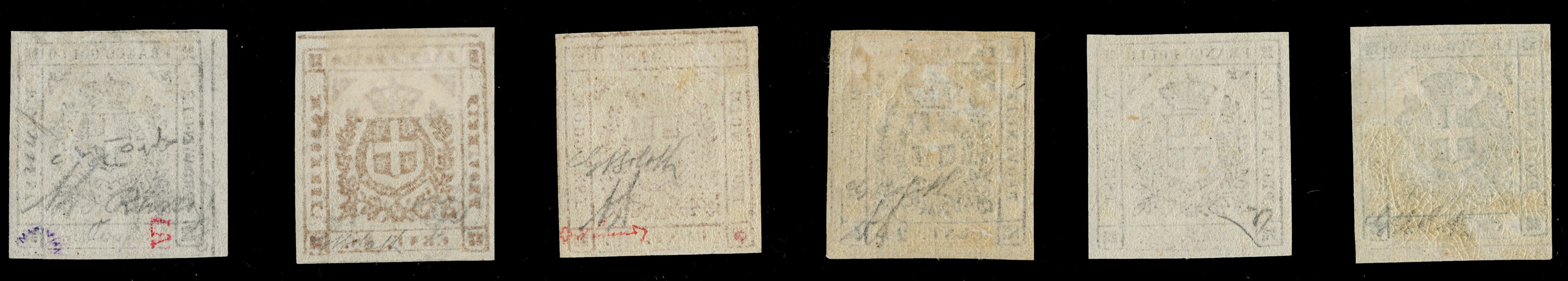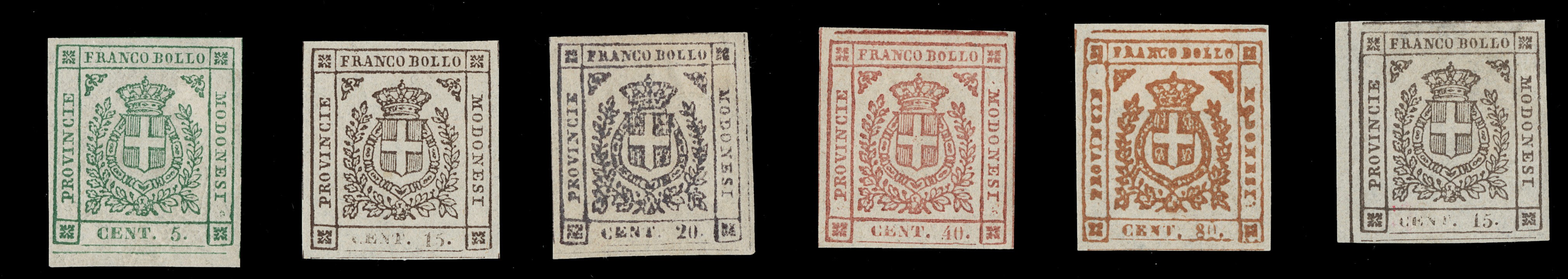 1859 - Governo Provvisorio, la serie di sei valori, compreso il 15c bruno e mancante del 20c lilla violaceo. Splendidi, CF Bolaffi 60% per il 15c bruno, 80% per gli altri (Sassone 12/14+16/18 - Euro 7.850)