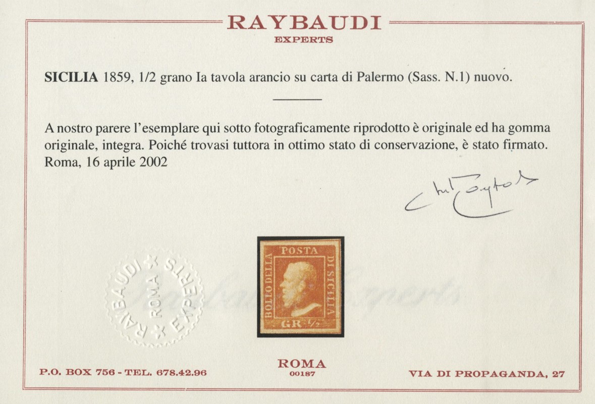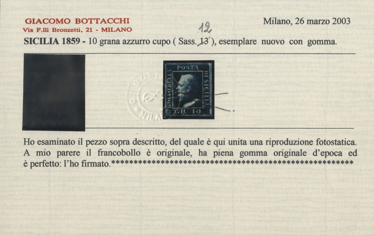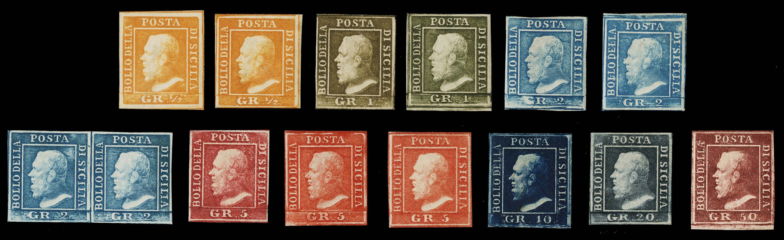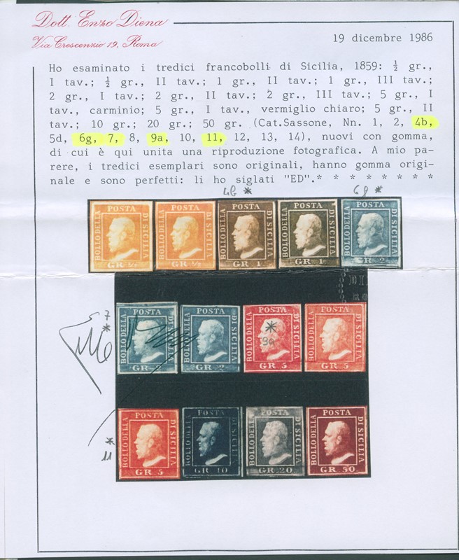 1859 - la serie dei francobolli di Sicilia, completa di tutte le tavole tranne l'1gr I tav. Francobolli nuovi TL, il 2gr III tav e' una coppia SL. Splendido insieme. Fotocopia CF E.Diena per tutti, e altri 5 CF Bottacchi, Raybaudi, Sorani e Zanaria (Sassone 1/14 - Euro 24.500)
