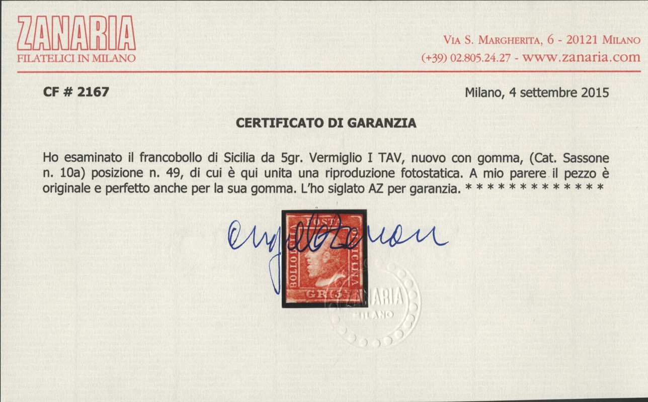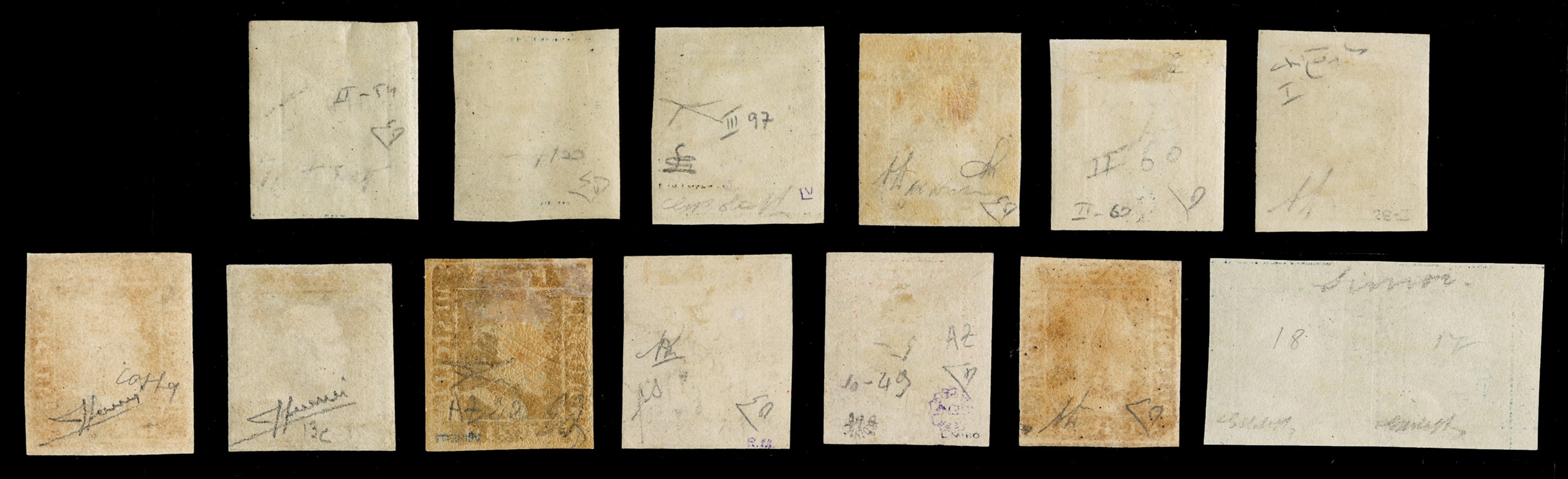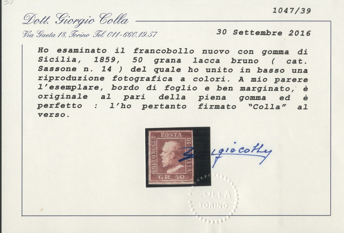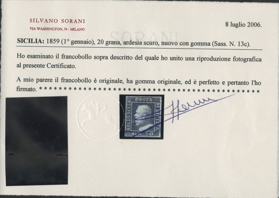 1859 - la serie dei francobolli di Sicilia, completa di tutte le tavole tranne l'1gr I tav. Francobolli nuovi TL, il 2gr III tav e' una coppia SL. Splendido insieme. Fotocopia CF E.Diena per tutti, e altri 5 CF Bottacchi, Raybaudi, Sorani e Zanaria (Sassone 1/14 - Euro 24.500)