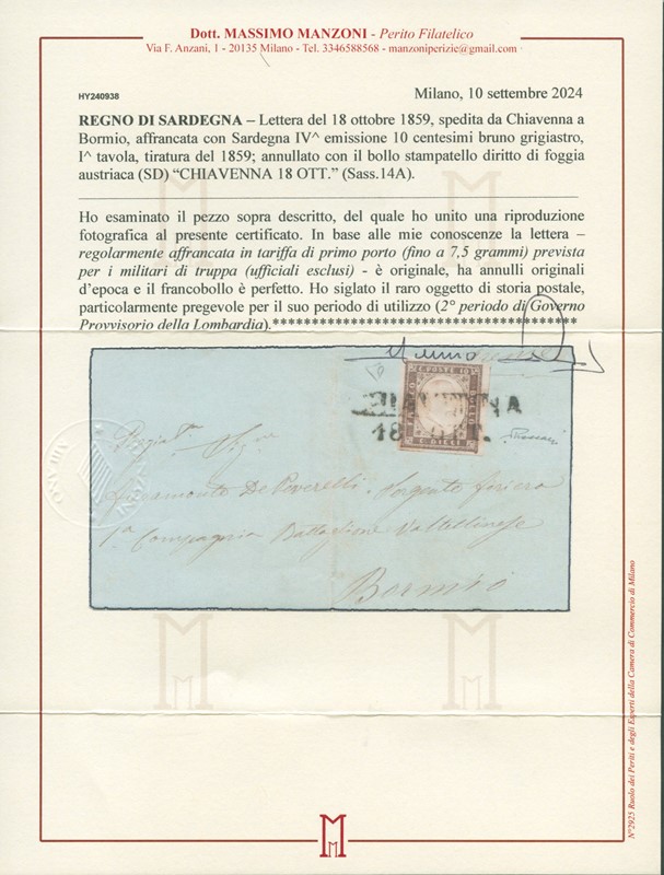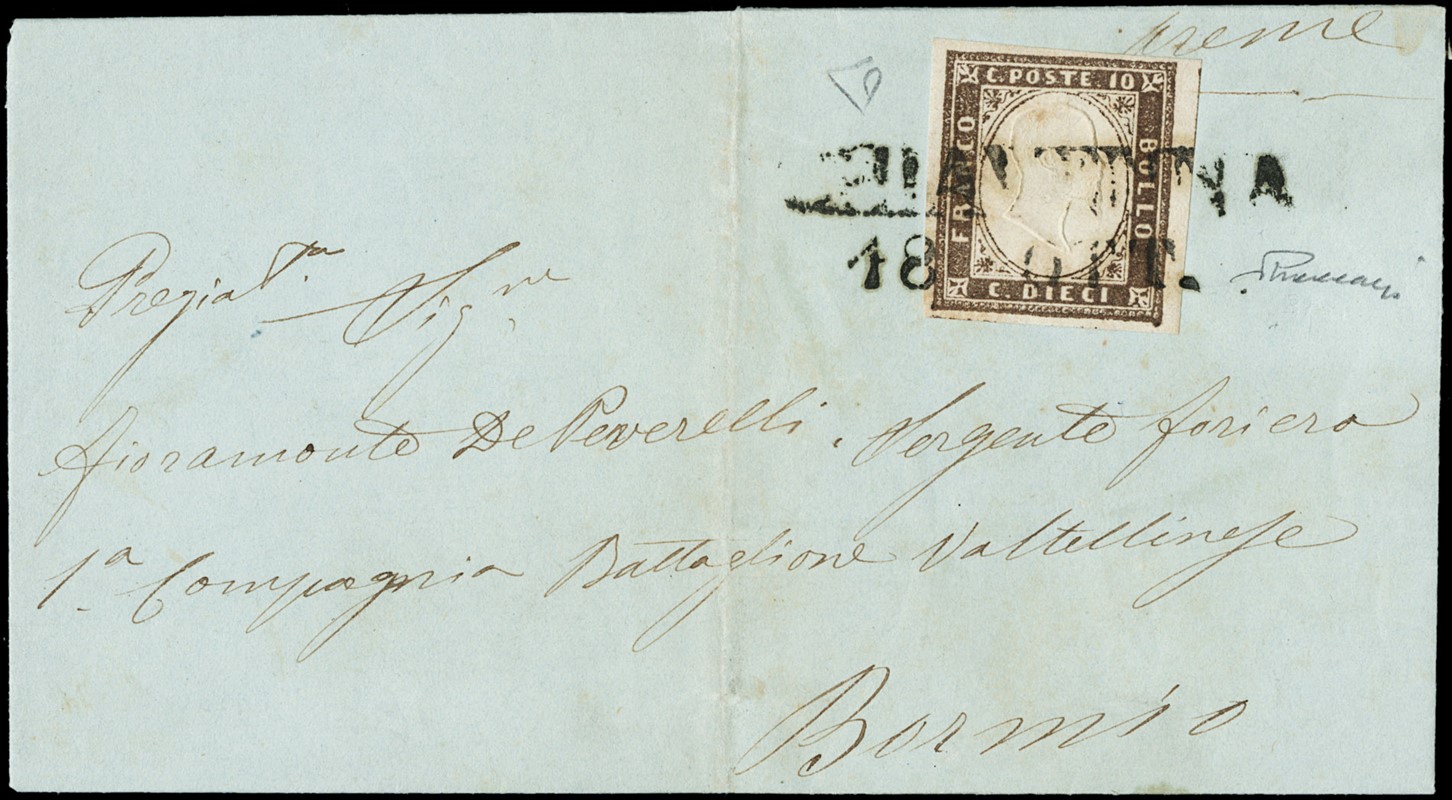 1859 - Sardegna 10c bruno grigiastro, I tav. tir.59, da 'CHIAVENNA 18 OTT.' a Bormio. Tariffa ridotta per militari di truppa 'I Compagnia Battaglione Valtellinese', spedita nel II periodo di Governo Provvisorio della Lombardia. Sigle E.Diena e Vaccari, CF Manzoni (Sassone 14A+pt.10 - Euro 5.450+)