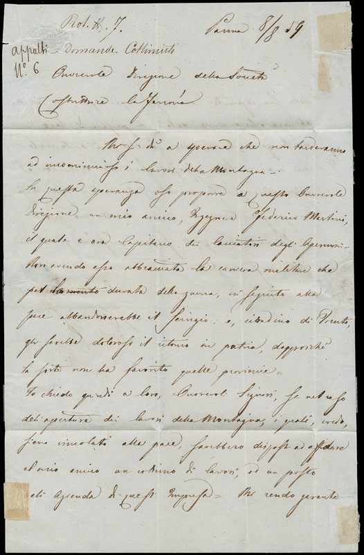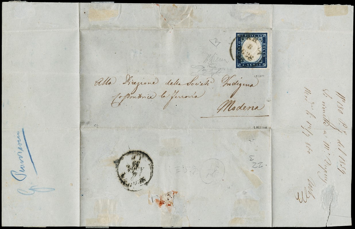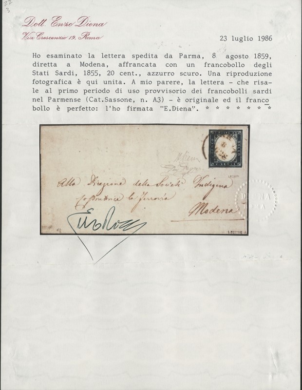 1859 - Sardegna IV emissione, 20c azzurro scuro, da 'PARMA 8 AGOS 59' a Modena. Rara lettera del I periodo di Governo Provvisorio. Firme Gaggero e A.Diena, CF E.Diena (Sassone A3 - Euro 30.000)