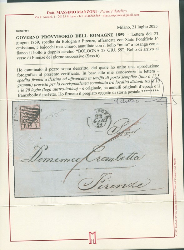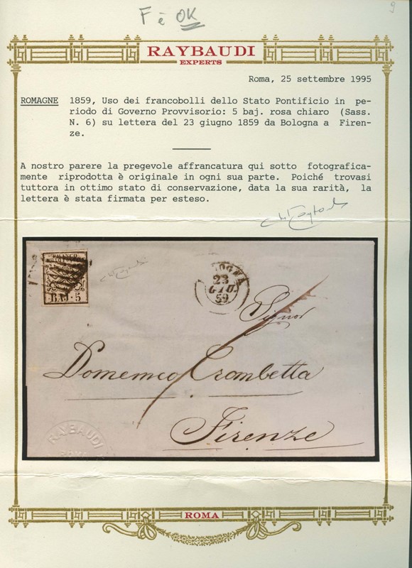 1859 - Stato Pontificio, 5b rosa chiaro, da 'BOLOGNA 23 GIU 59' per Firenze, in periodo di Governo Provvisorio. Raro, CF Manzoni e Raybaudi (Sassone 6 - Euro 11.000)