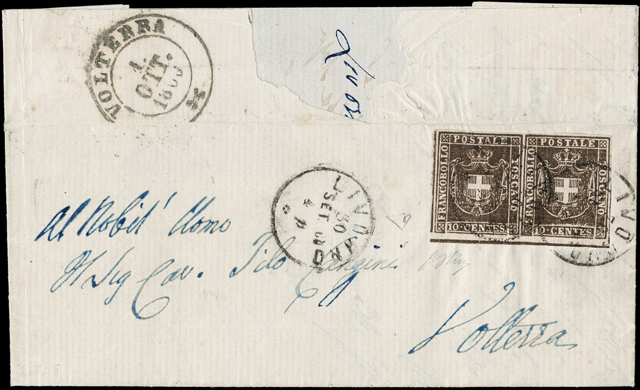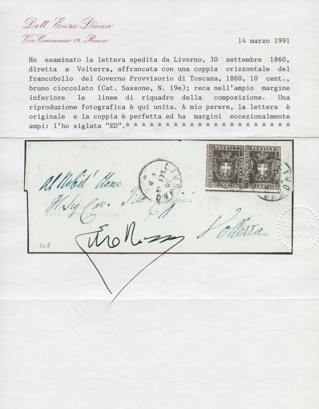 1860 - 10c bruno cioccolato, coppia orizzontale BdF inferiore con margini bianchi e linea di riquadro nel margine di foglio in basso da 'LIVORNO 30 SET 60' per Volterra. Firma G.Oliva, CF E.Diena (Sassone 19k - Euro 8.000++)