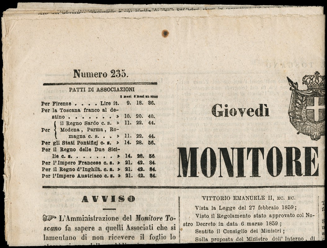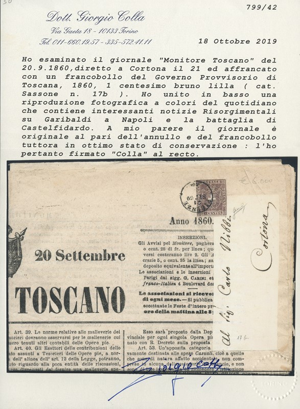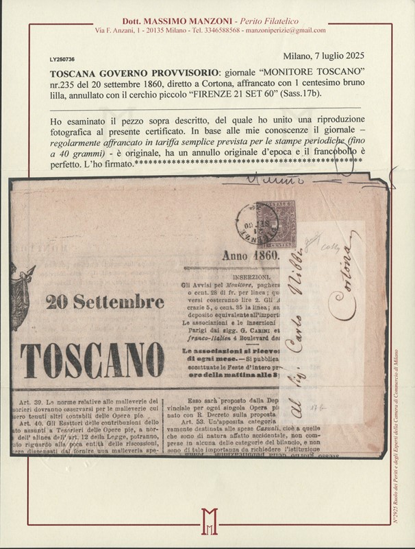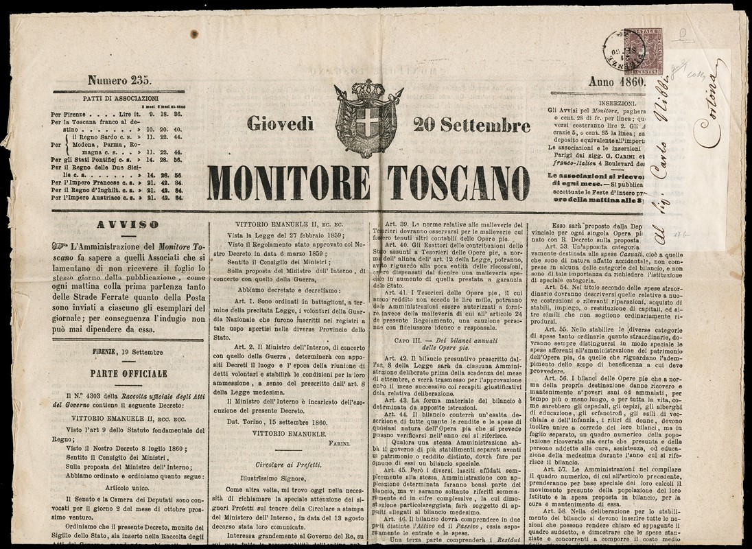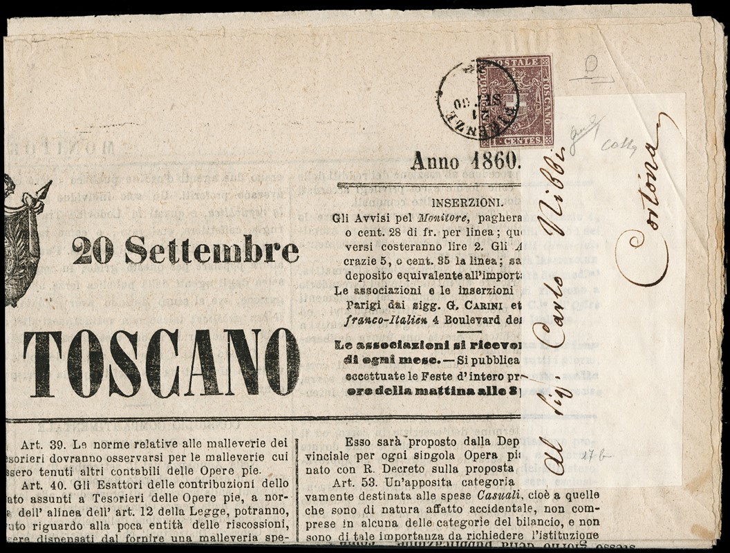 1860 - 1c bruno lilla su giornale 'MONITORE TOSCANO' del 20 settembre, da 'FIRENZE 21 SETT 60' per Cortona. CF Colla e Manzoni (Sassone 17 - Euro 6.750)
