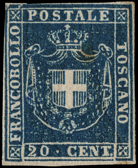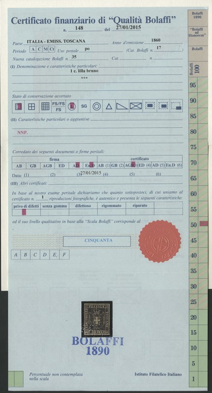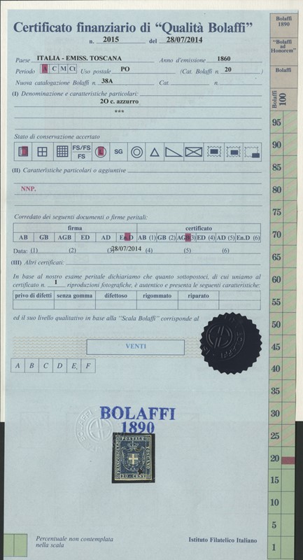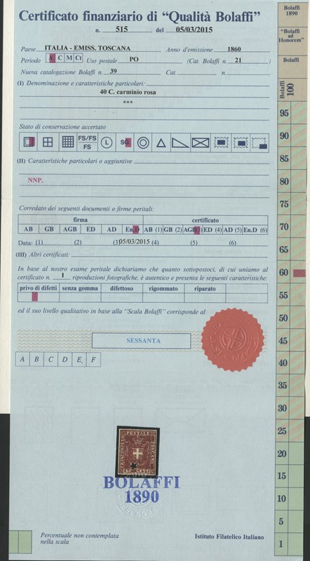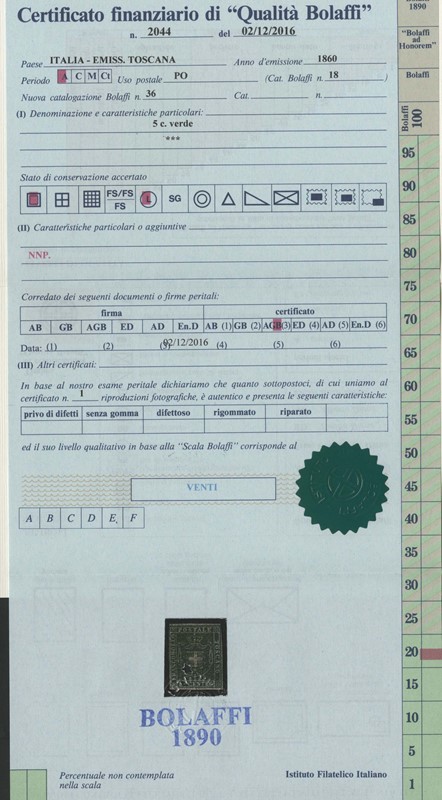 1860 - 1c violetto bruno, 5c verde, 20c azzurro (piccole macchie di ruggine) e 40c carminio (leggero assottigliamento), nuovi. Il 40c SG, gli altri TL. Rari, 4 CF Bolaffi e 4 Manzoni (Sassone 17+18+20+21 - Euro 89.250)