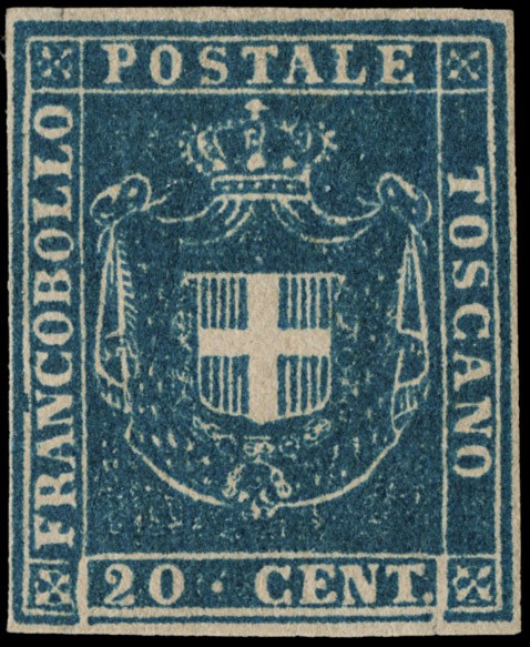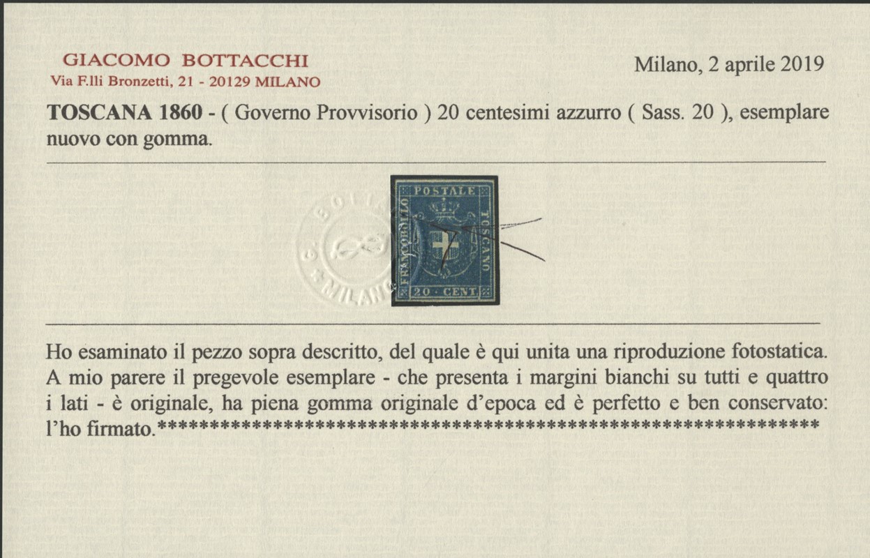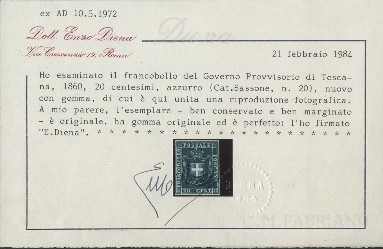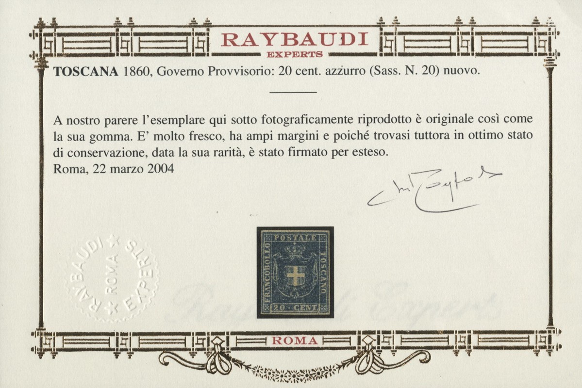 1860 - 20c azzurro, nuovo con gomma, margini bianchi. CF Bottacchi, E.Diena e Raybaudi (Sassone 20 - Euro 32.000)