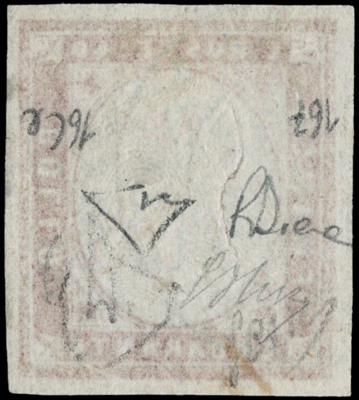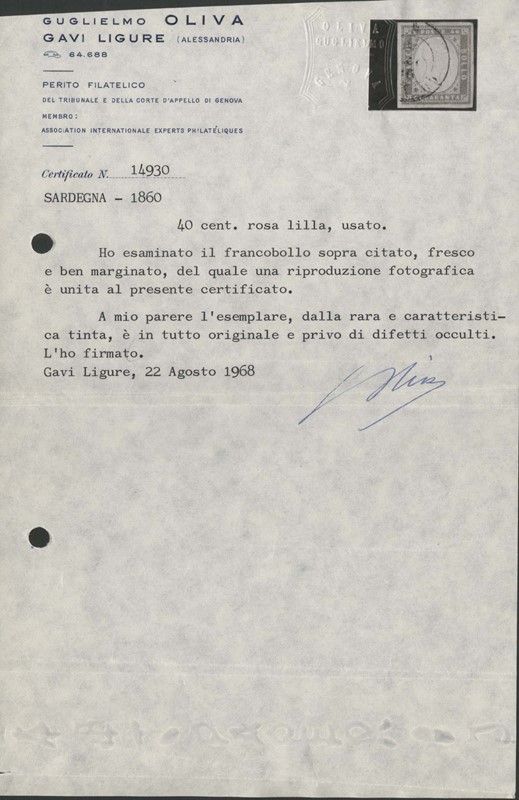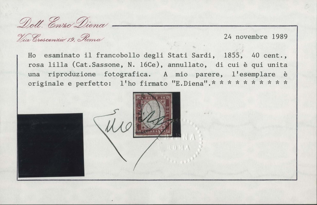 1860 - 40c rosa lilla, usato. Rara e caratteristica tonalita' di colore, francobollo perfetto e molto ben marginato. Sigla Em.Diena, CF Guglielmo Oliva ed E.Diena (Sassone 16Ce - Euro 22.000)