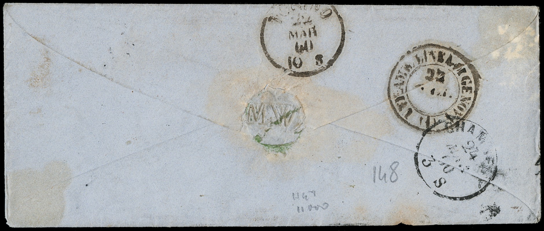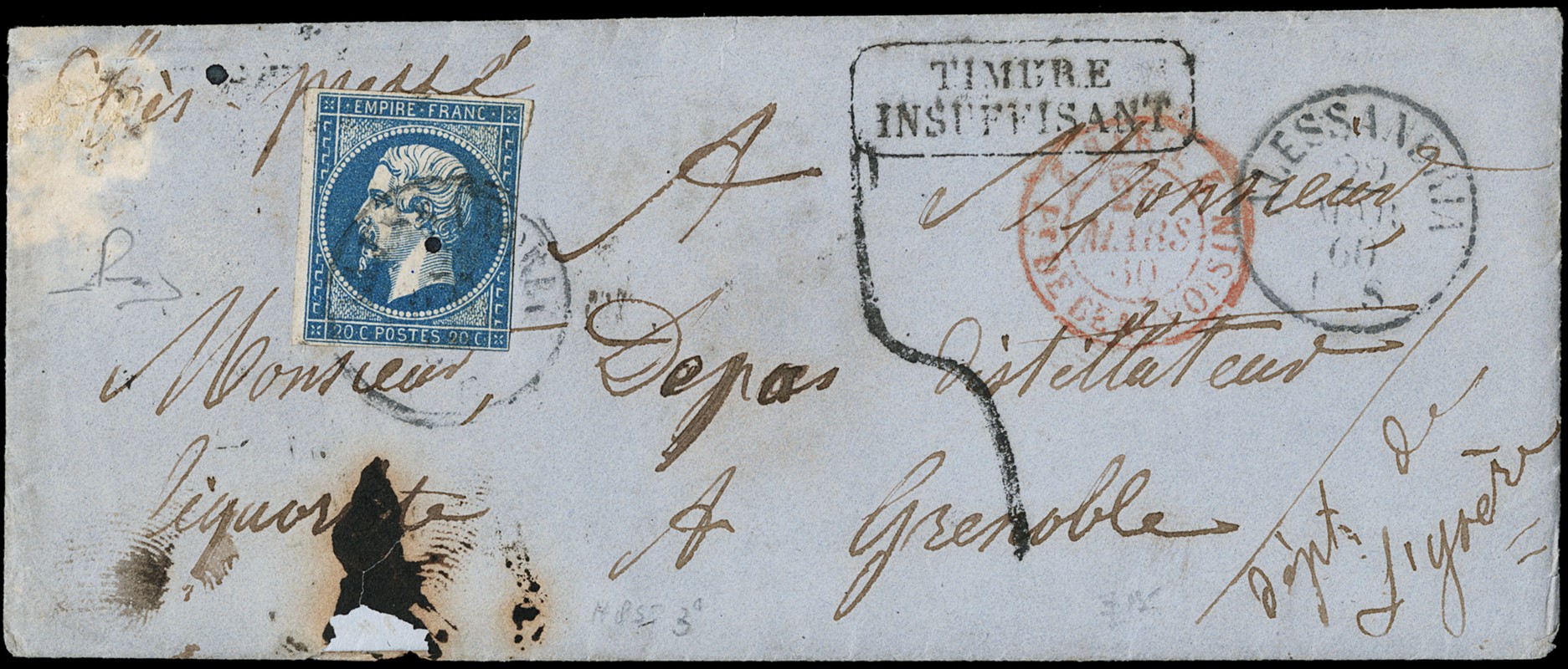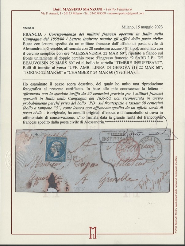 1860 - Francia, Napoleone III 20c azzurro (Yvert 14) spedita da un militare francese dall'ufficio di posta civile di 'ALESSANDRIA 22 MAR 60' per Grenoble, con bollo 'TIMBRE INSUFFISANT' e tassa '4' al recto. Rarissima. Ex Dubus, CF Manzoni (Sassone pt.R2 - Euro 37.500)