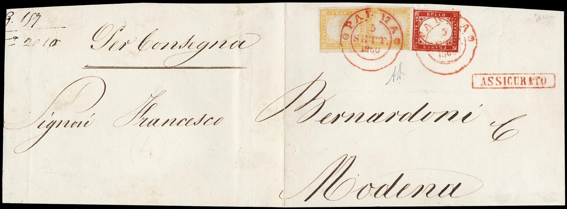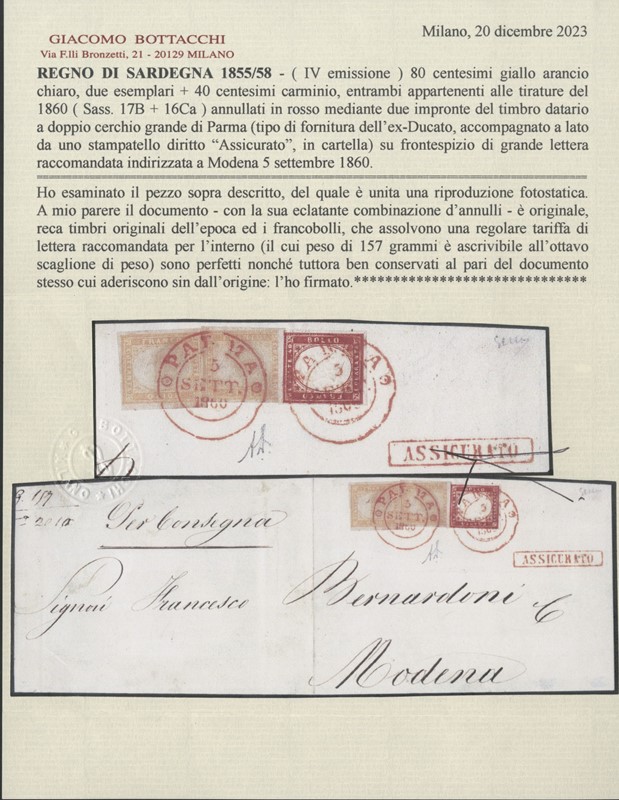 1860 - Sardegna IV emissione, 40c carminio e 80c giallo arancio, due esemplari, su frontespizio 'ASSICURATO' da 'PARMA 5 SETT. 1860' (entrambi in rosso) per Modena. CF Bottacchi (Sassone 16Ca+17B+pt.10 - Euro 14.000: 2 = Euro 7.000++)